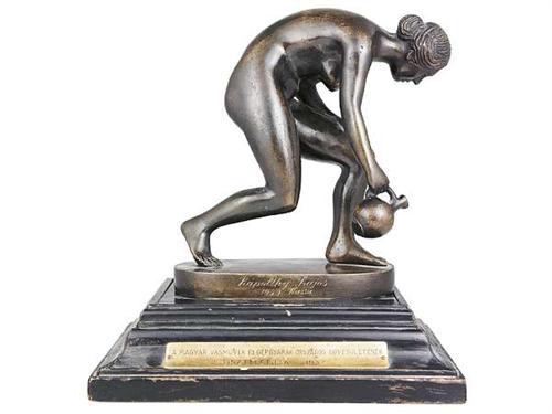 Cast bronze with patina, replaced wooden base. Marked back on the base: Rápolthy Lajos, 1939, Kassa. Size: 23 cm