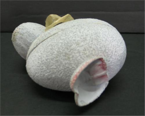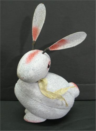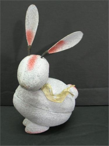 PAPIER-MACHE RABBIT CANDY CONTAINER. Light blue painted rabbit has ears that are attached to head by springs. Marked “Germany” on bottom. 7.5” H