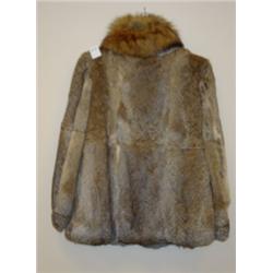 Rabbit fur jacket with red fox collar. Hook closure. Cuff band. Satin lining. Size - Small. Condition: Very Good