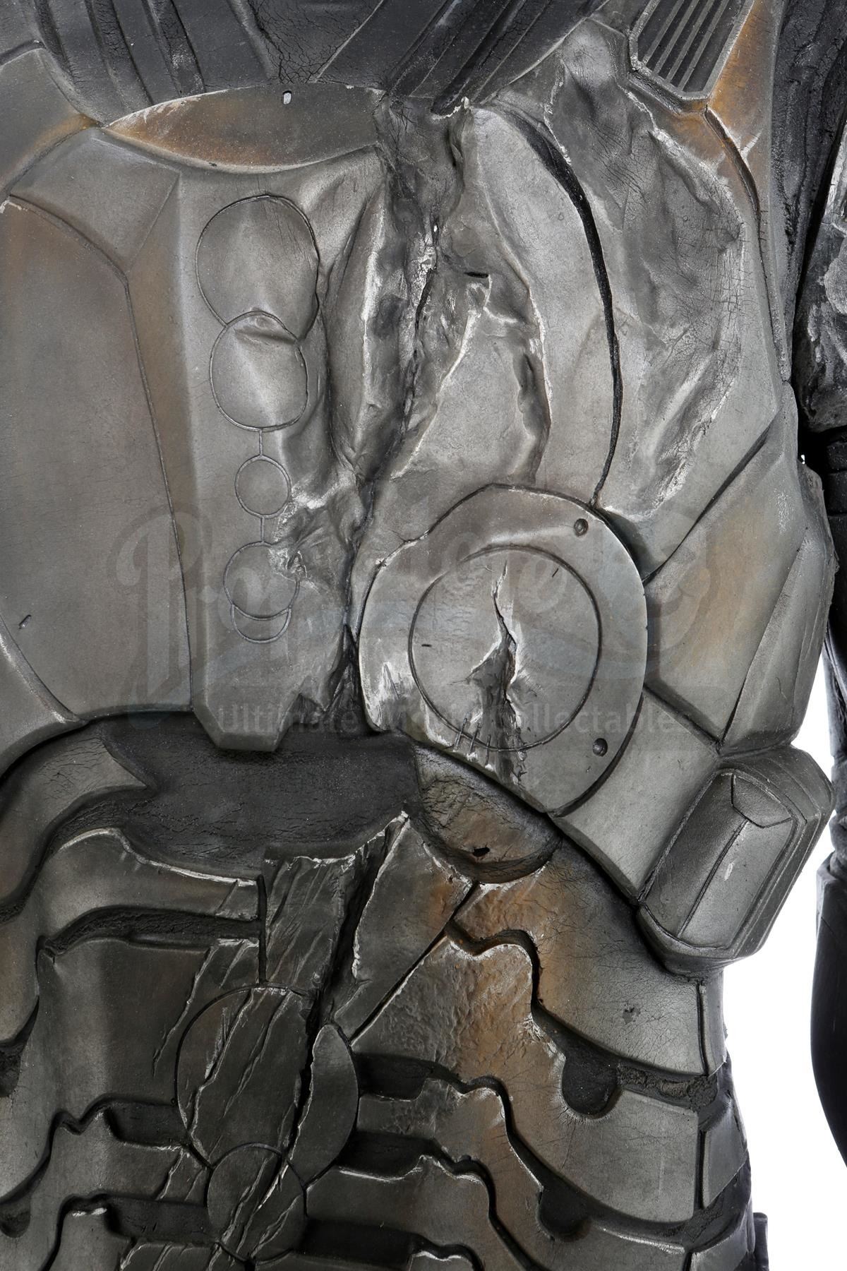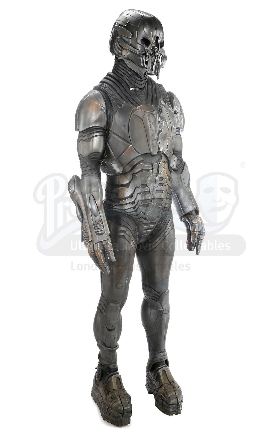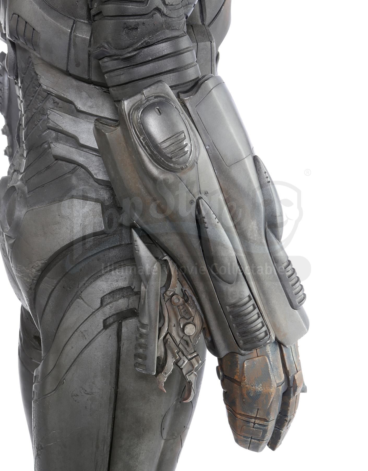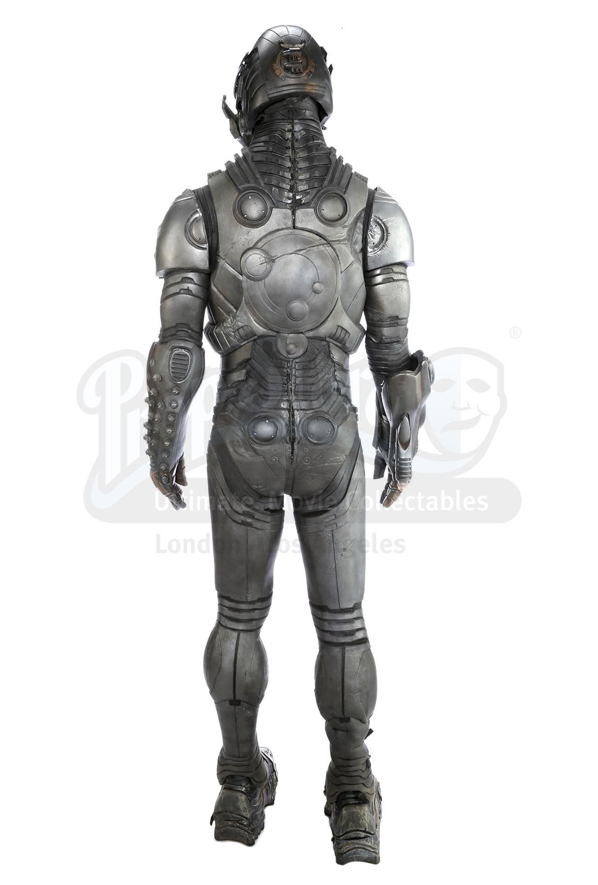 This costume comprises a charcoal foam-latex bodysuit; a charcoal rubber helmet with black urethane lenses and silicone gel padding on the interior; a detachable resin arm gun; a pair of copper-coloured foam gauntlets; a pair of black rubber Merrell boots with otherworldly moulding; and a foam-rubber neckpiece marked "Paul" for stunt double Paul Darnell. The suit is purposely distressed throughout to appear battle-damaged and melted.