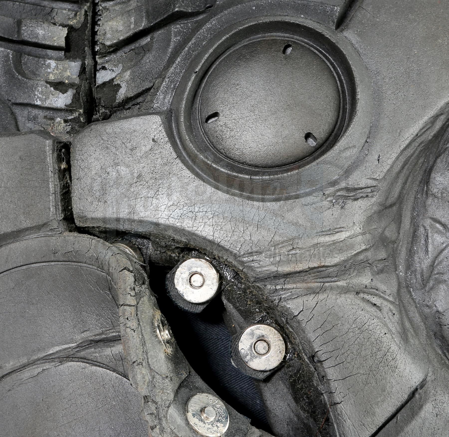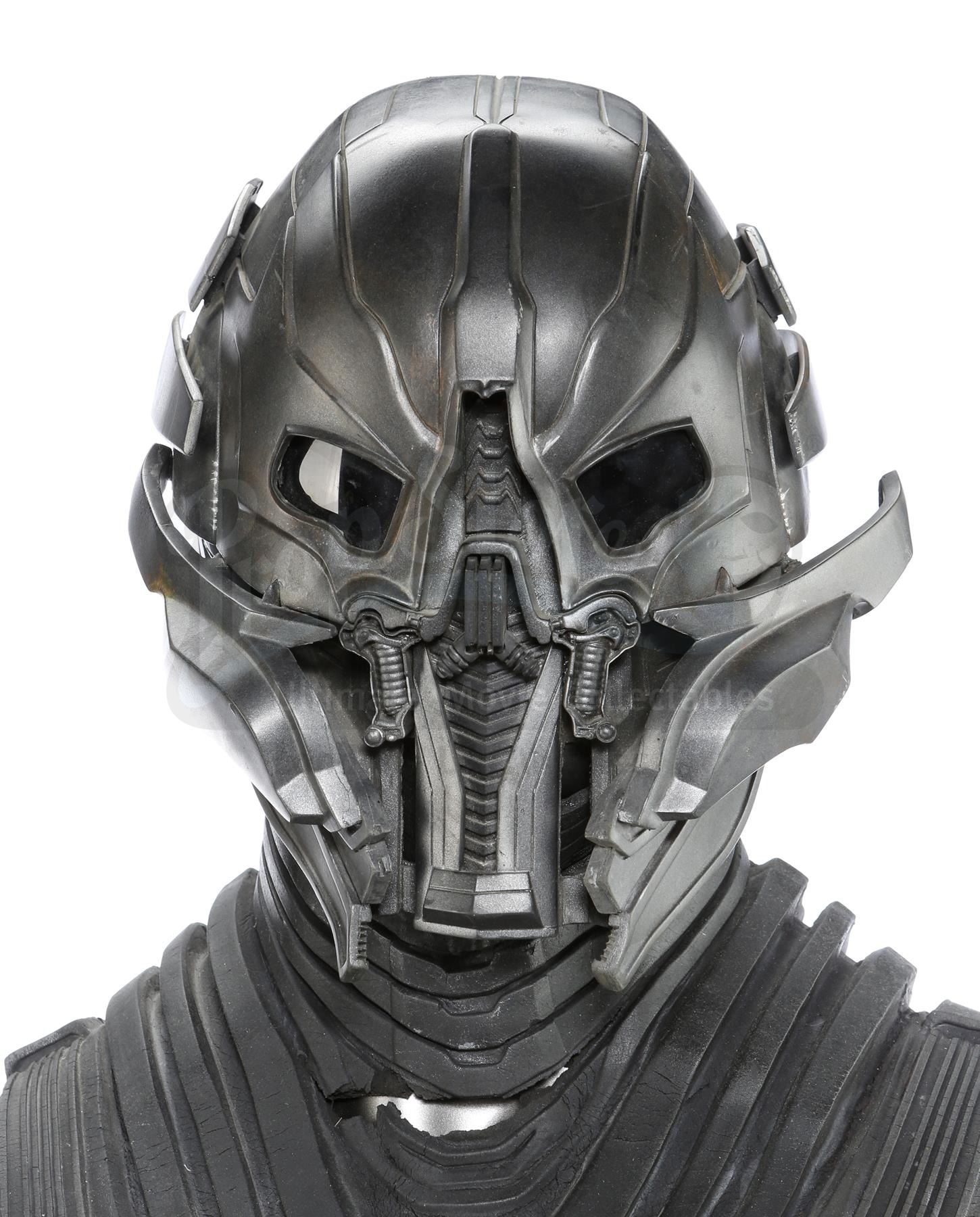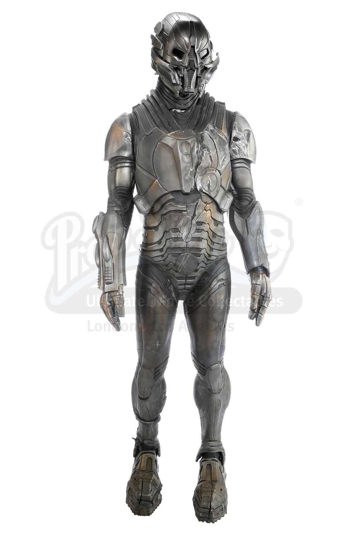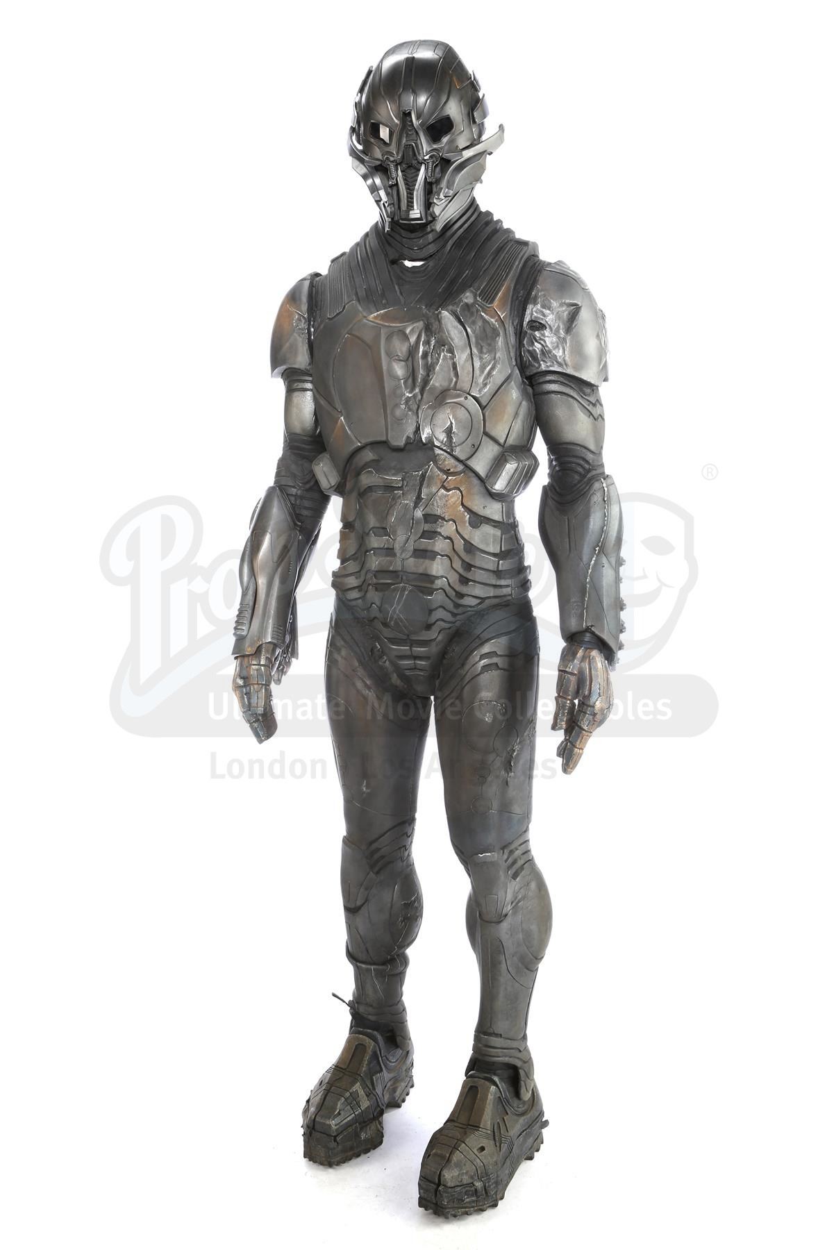 This costume comprises a charcoal foam-latex bodysuit; a charcoal rubber helmet with black urethane lenses and silicone gel padding on the interior; a detachable resin arm gun; a pair of copper-coloured foam gauntlets; a pair of black rubber Merrell boots with otherworldly moulding; and a foam-rubber neckpiece marked "Paul" for stunt double Paul Darnell. The suit is purposely distressed throughout to appear battle-damaged and melted.