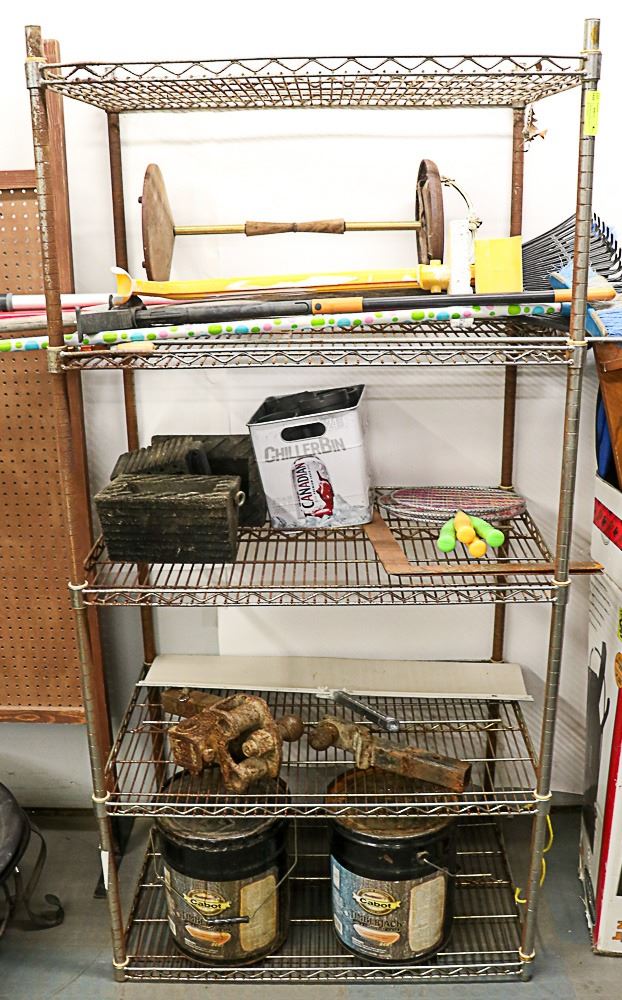 BROOMS, DECOR, RAKES, ASHTRAYS NEWER AND SOME VINTAGE, TRAILOR HITCHES, CABOT TIMBER JACK LOG + TIMBER FRAME FINISH, METAL RACK IS INCLUDED IN THIS LOT AS WELL
