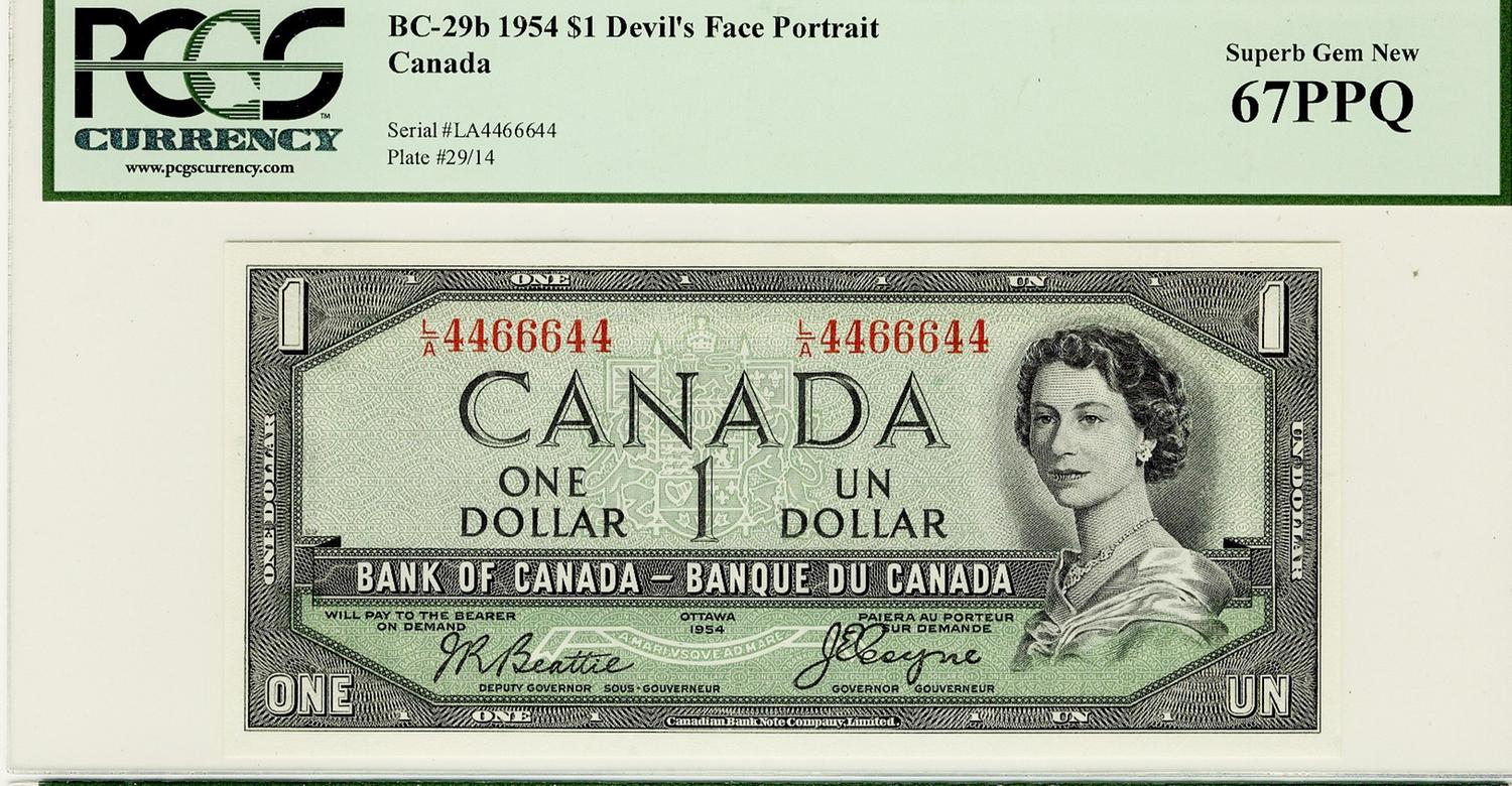 RADAR 1954 $1 BC-29b #4466644 PCGS Superb GEM UNC 67PPQ. Rarely seen!