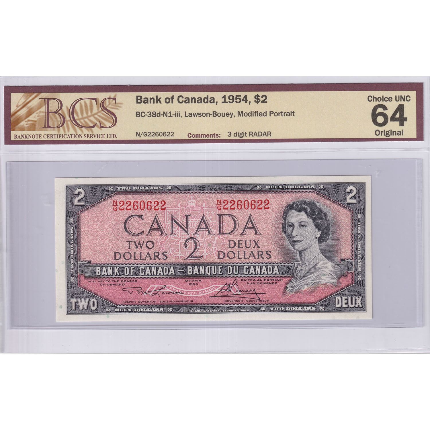 RADAR: 1954 $2 BC-38d-N1-iii, Bank of Canada, Lawson-Bouey, Modified Portrait, 3 Digit RADAR, S/N: N/G2260622, BCS Certified CUNC-64 Original.