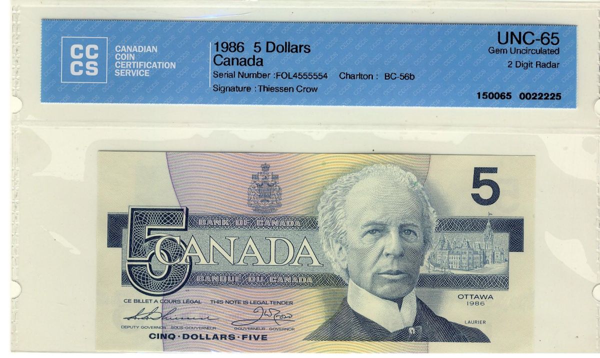 RADAR 1986 $5 BC-56b #FOL4555554 CCCS UNC65
