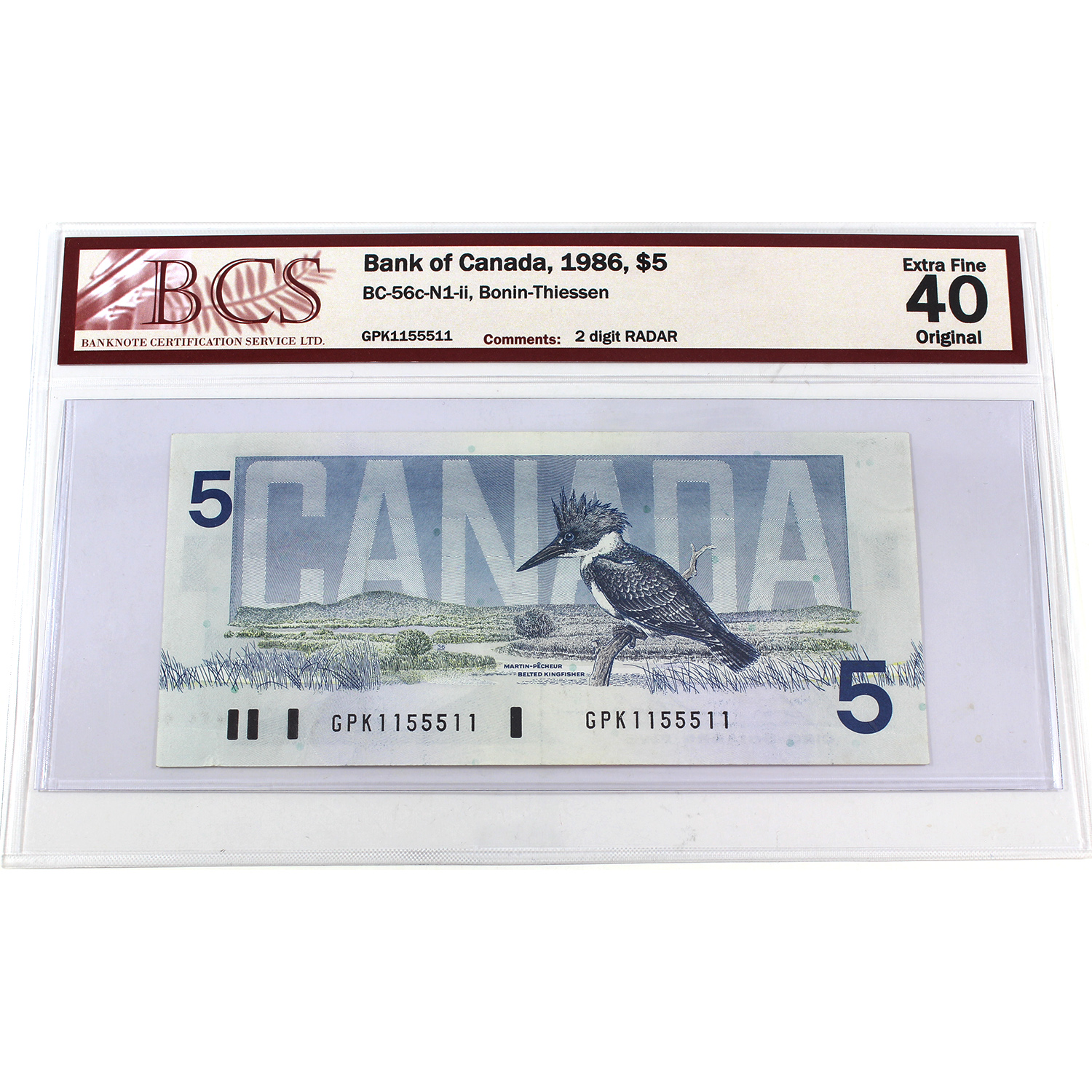 RADAR BC-56c-N1-ii 1986 $5 2-digit RADAR BCS EF40 Original Bonin-Thiessen SN:GPK1155511