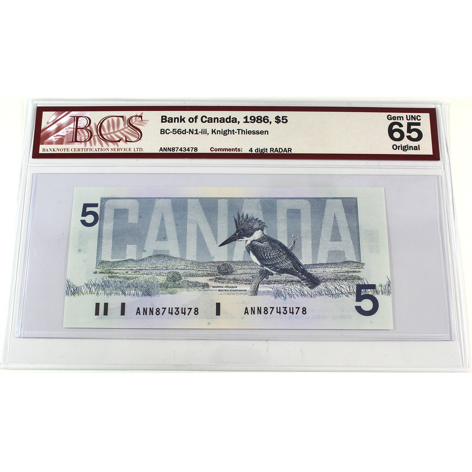RADAR BC-56d-N1-iii 1986 $5 4-digit RADAR BCS GEM UNC65 Original Knight-Thiessen SN:ANN8743478