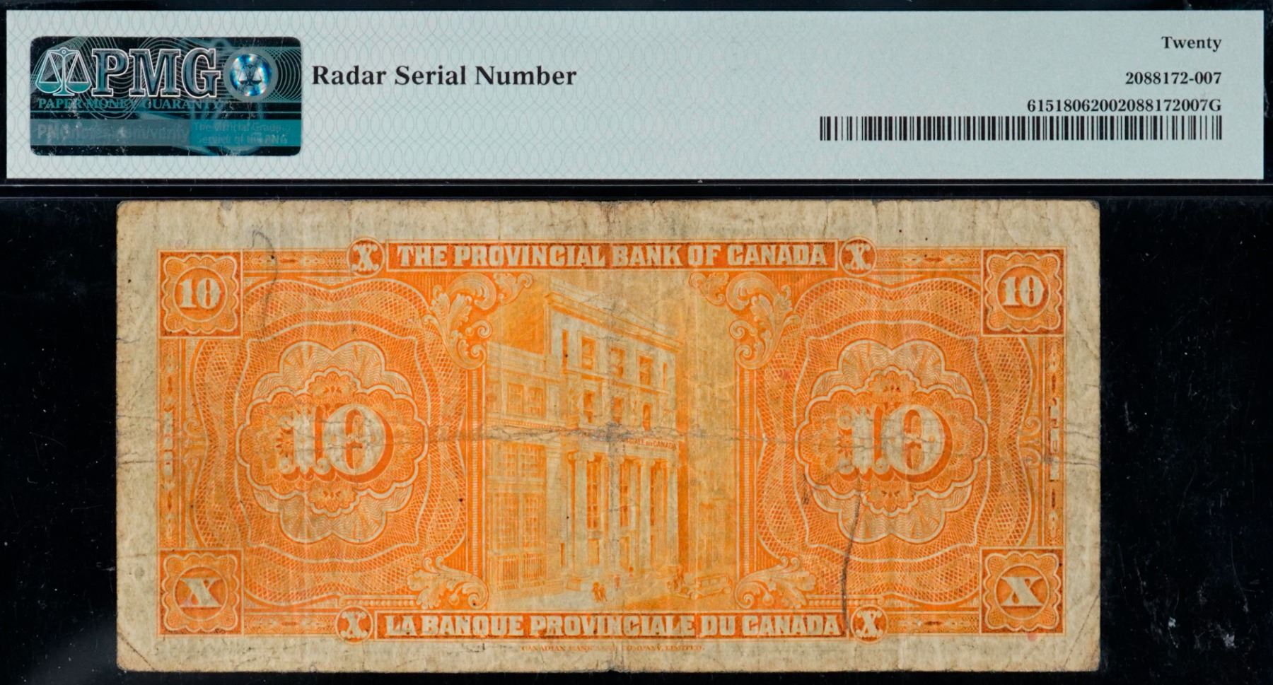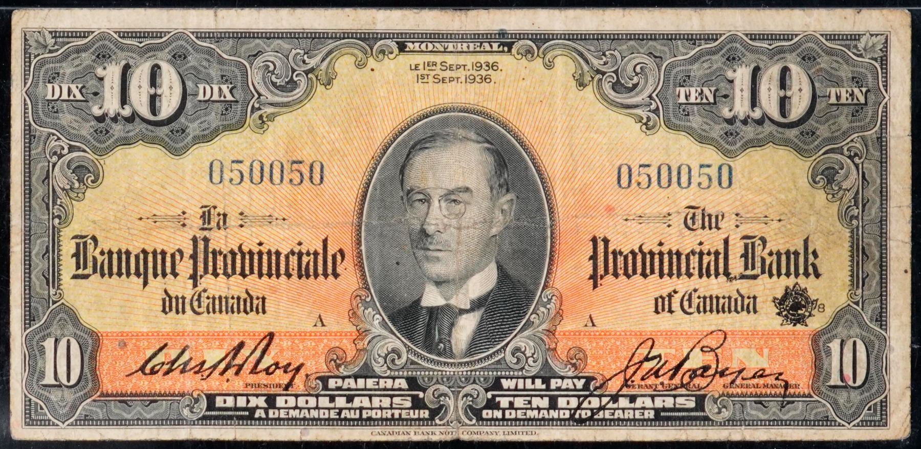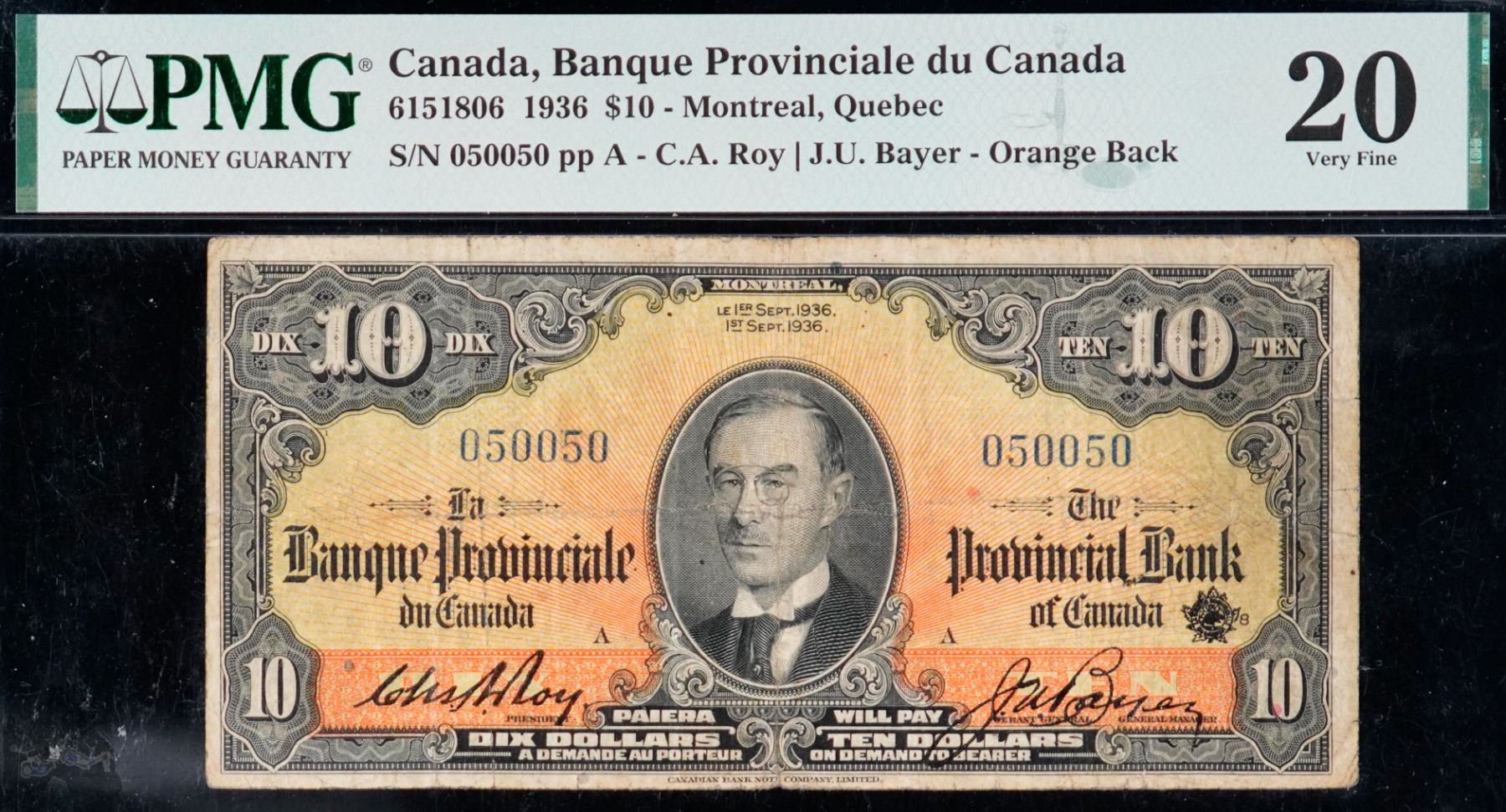 RADAR; La Banque Provinciale 1936 $10 #050050 PMG Very Fine-20