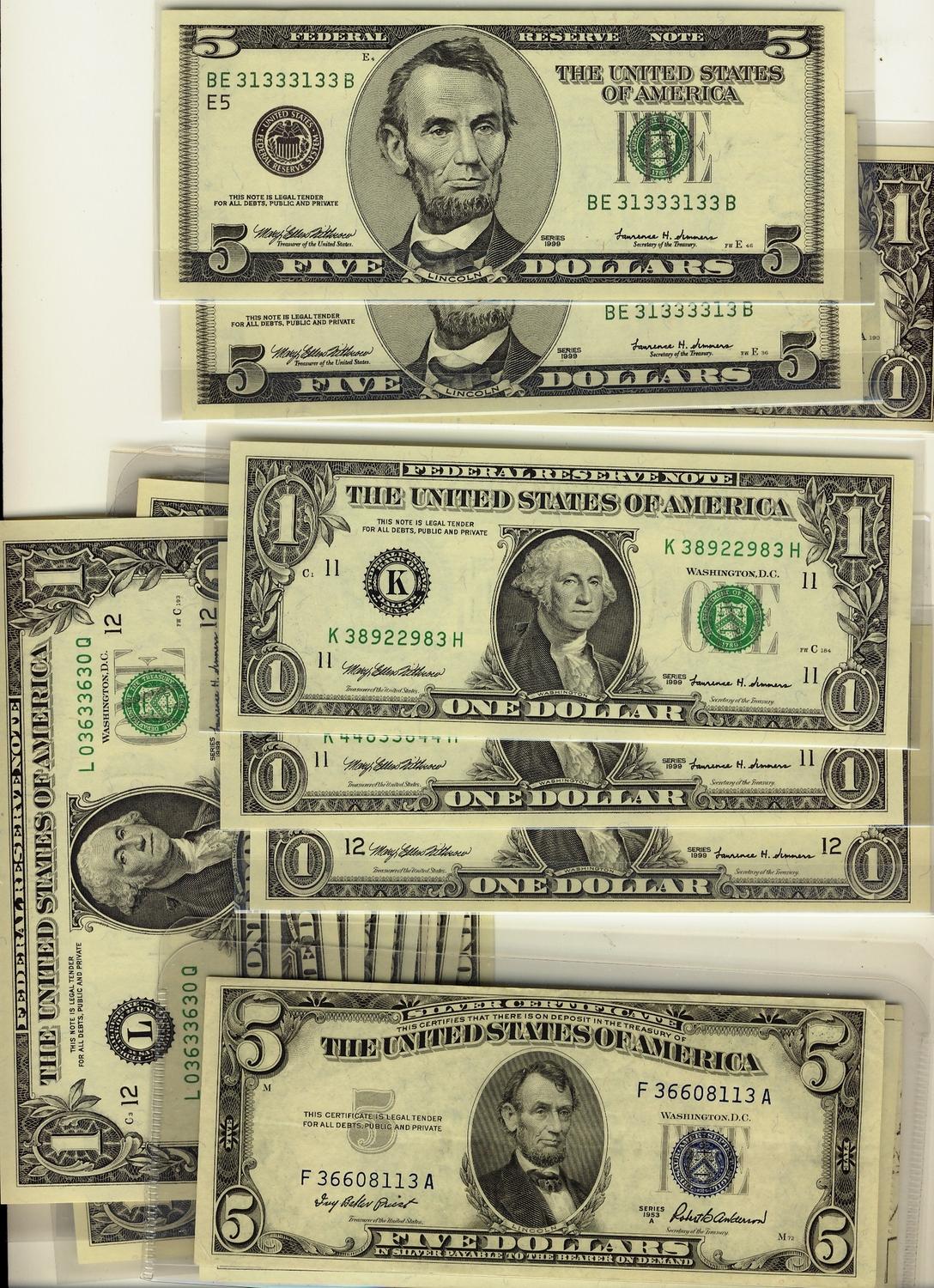 RADAR Notes. Small lot of US issues including Federal Reserve $1 issues 1963, 1988 & 1999(6) with $5(2). Lot also includes 6 four digit repeater notes, 1953A Silver Certificate EF, 1976 $2 with stamp and 1995 $1 with stamp. Includes 21 notes in all.