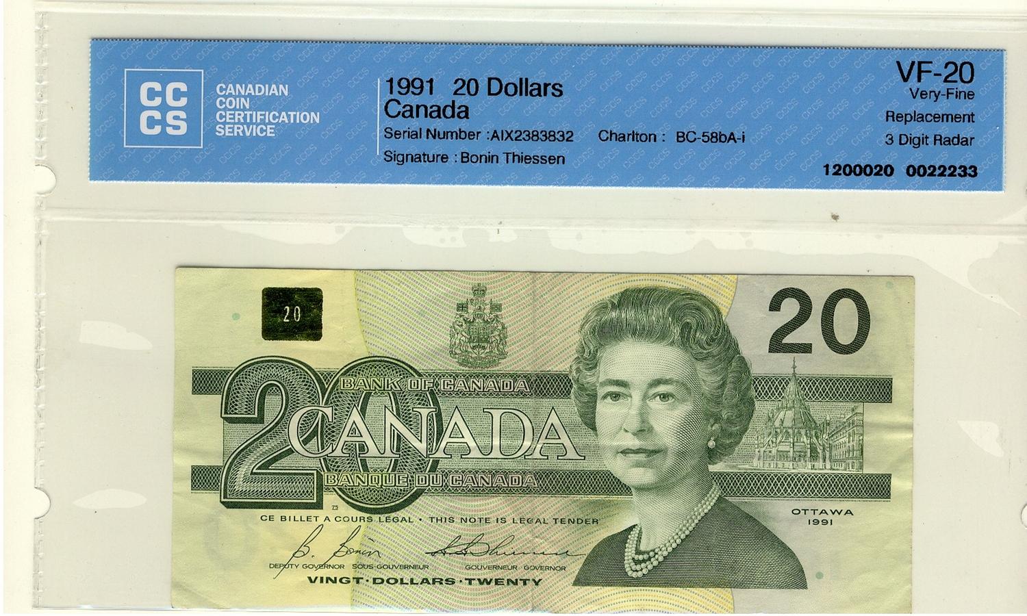 RADAR/REPLACEMENT 1991 $20 BC-58bA-i #AIX2383832 CCCS VF20