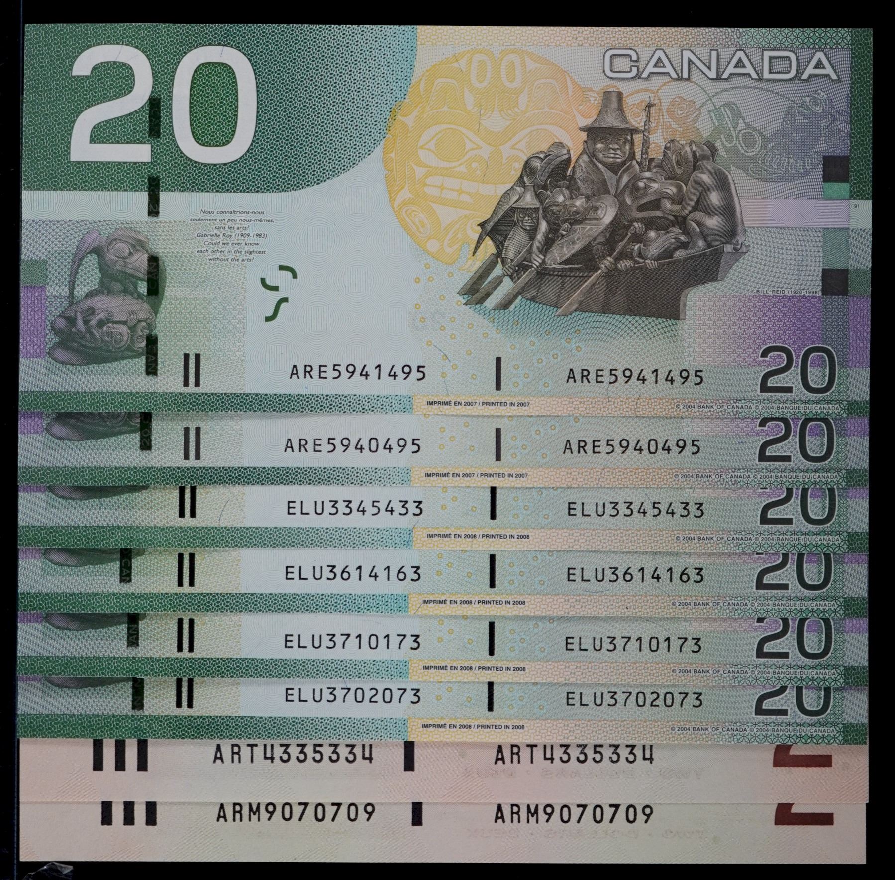 RADARS; 1986 $2 (2) & 2004 $20 (6) Lot of 8 Radar notes. Uncirculated