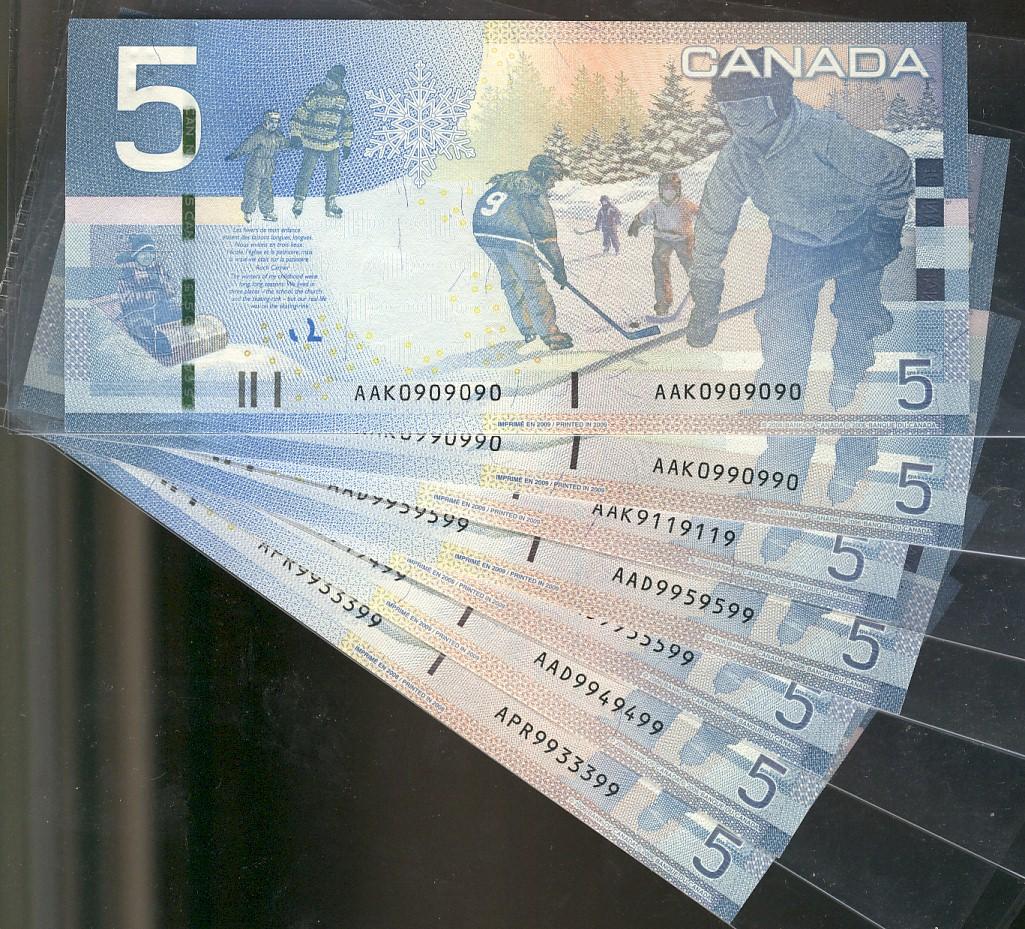 RADARS, 2009 $5 BC-67b. Lot includes #AAK0909090, AAK0990990, AAK9119119, AAD9959599, AAD9955599, AAD9949499 & APR9933399. Lot of 7 Original UNC notes.