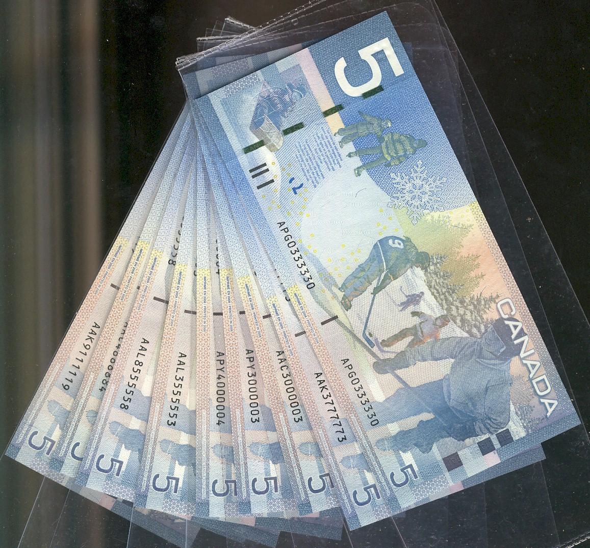 RADARS, 2009 $5 BC-67b. Lot includes, #APG0333330, AAK3777773, AAC3000003, APY3000003 & APY4000004, AAL3555553, AAL8555558, AAC4888884 & AAK9111119. Lot of 9 Original UNC notes.
