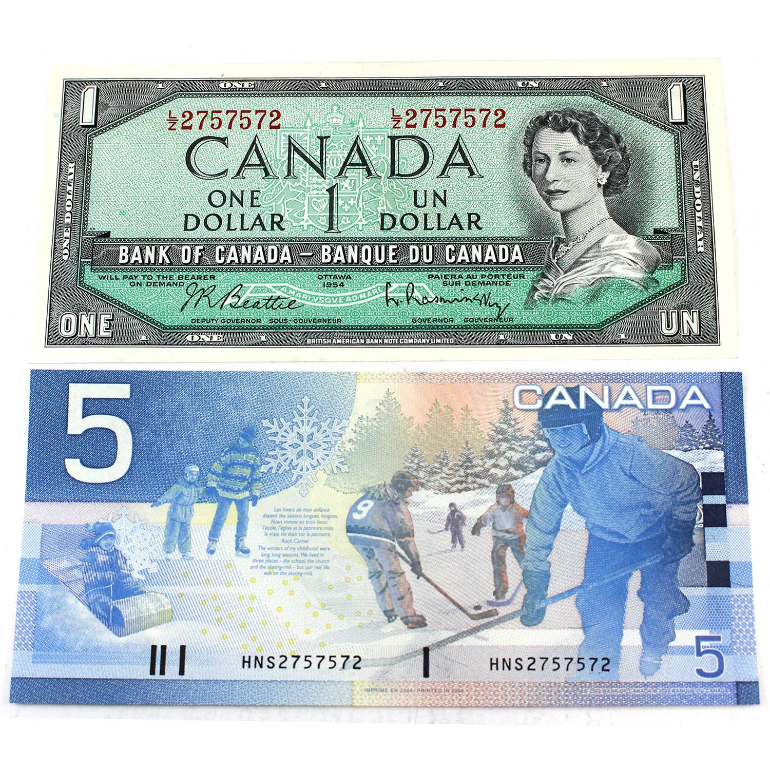INCLUDES: BC-37b-i 1954 $1 L/Z2757572 & BC-62b 2004 $5 HNS2757572