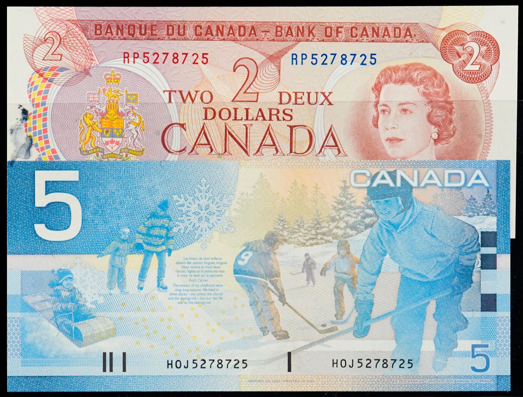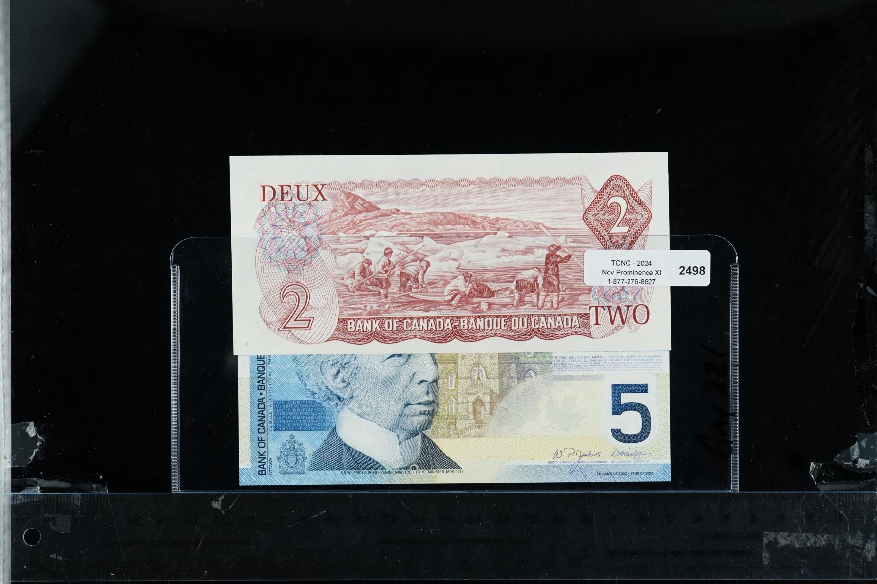 RADARS; Matching Pair. Includes 1974 $2, 2002 $5, both with same serial numbers: S/N5278725. Ch Un