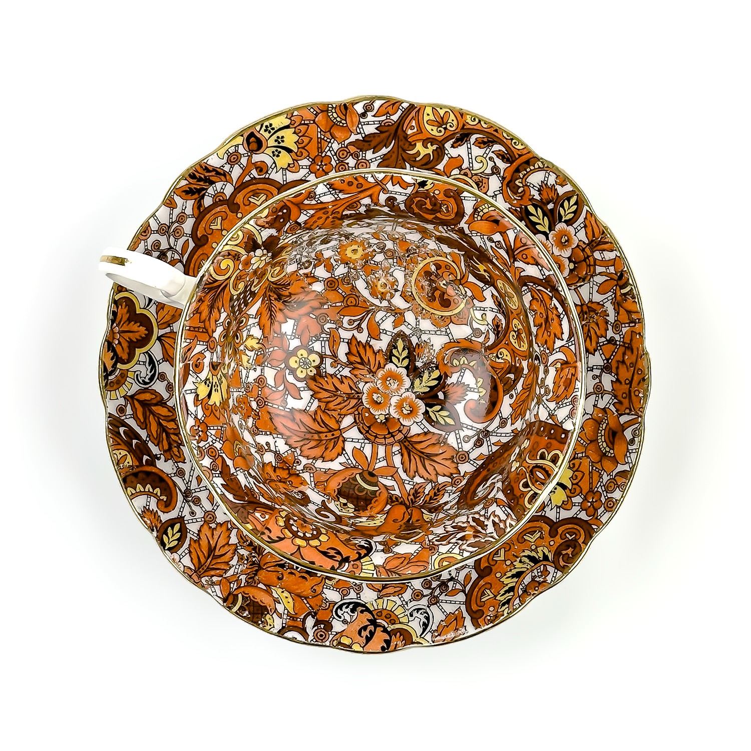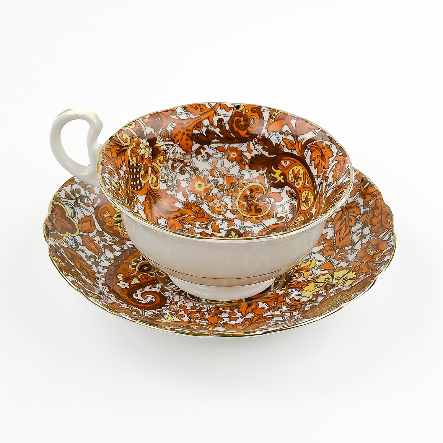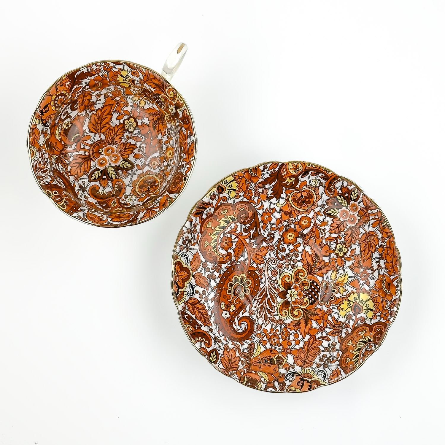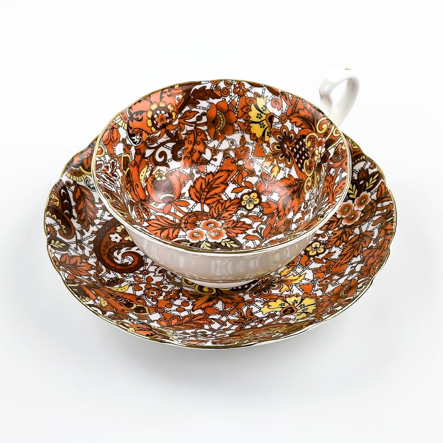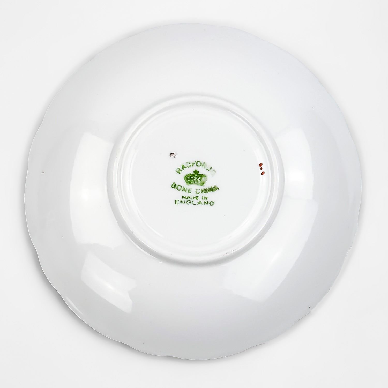 #8611 - VINTAGE TEA CUP AND SAUCER SET. RADFORDS - BONE CHINA - MADE IN ENGLAND. PATTERN NUMBER 8554/B - BACK STAMP IS DATED FROM 1938-1955. KITCHENWARE DINNERWARE. SAUCER MEASURES 5.75” (14.5 CM) DIAMETER. CUP TOP DIAMETER IS 4” (10 CM)