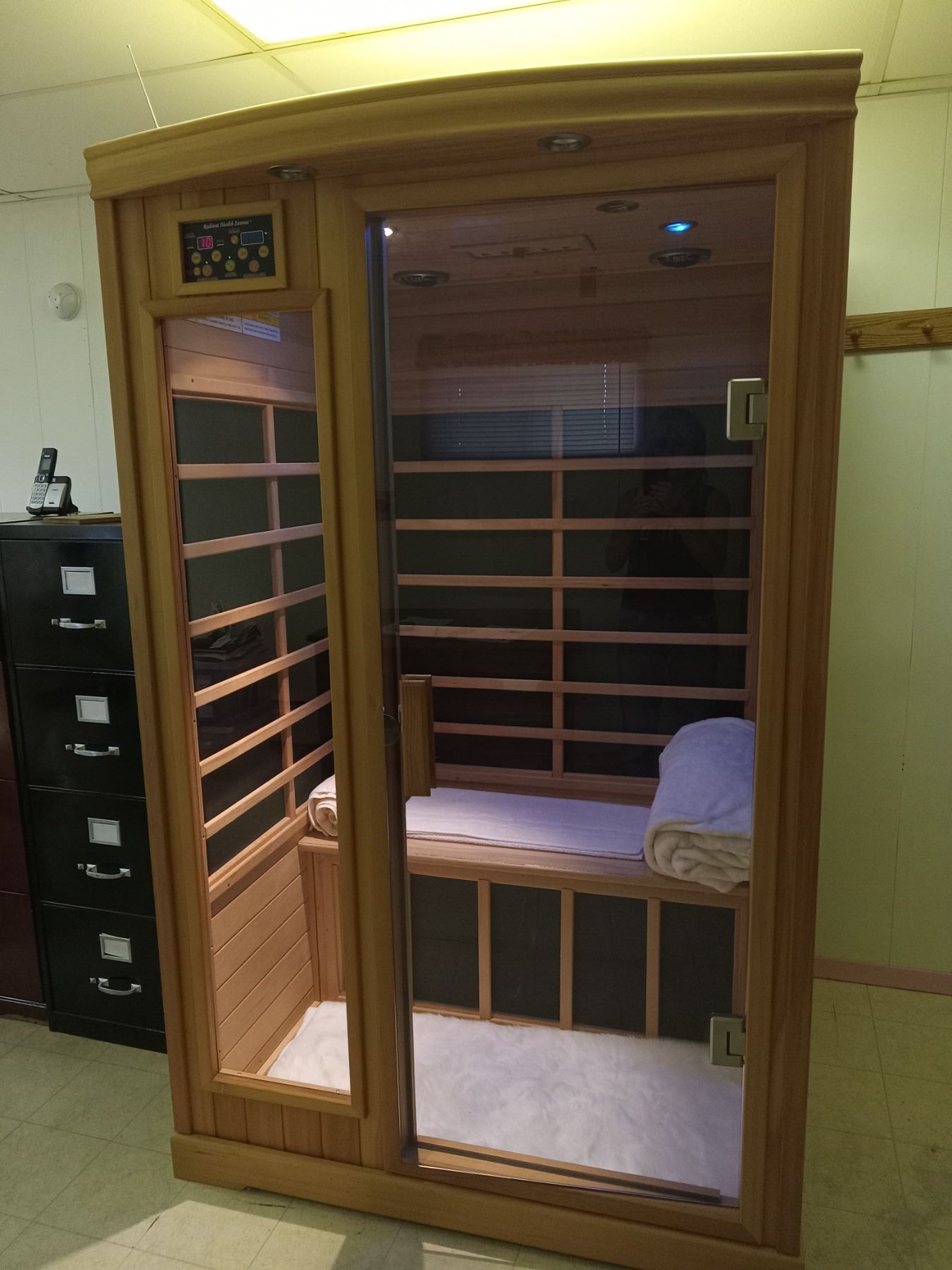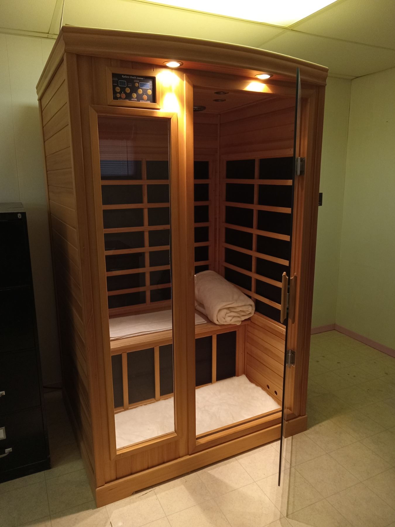 RADIANT HEALTH SAUNA MODEL E-2H(1G-520-BH) INFRARED COLOR LIGHT THERAPY SYSTEM C/W WHITE FUR CARPET,BLANKET, 3 TOWELS, BUILTIN RADIO /CD/MP3 PLAYER/ RECEIVER AND REMOTE CONTROL. NOTE UNIT WILL NEED TO BE DISASSEMBLES BY BUYER. UNIT IS LOCATED APPROX 20 MINUTES FROM THE SALE SITE AND A LATE REMOVAL CAN BE ARRANGED IF NEEDED