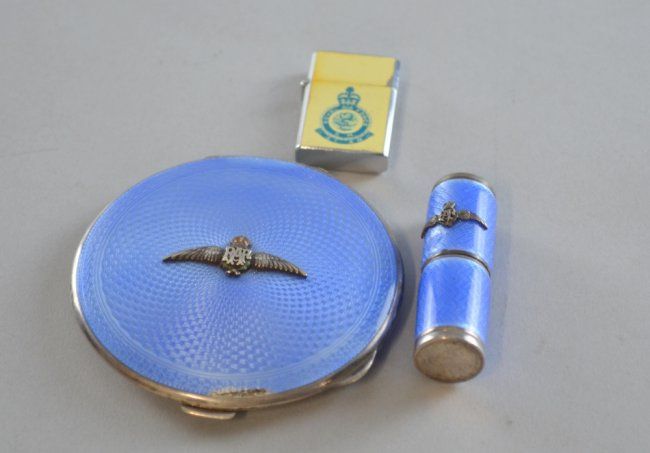 RAF blue enamelled silver compact and lipstick case and chrome cigarette lighter