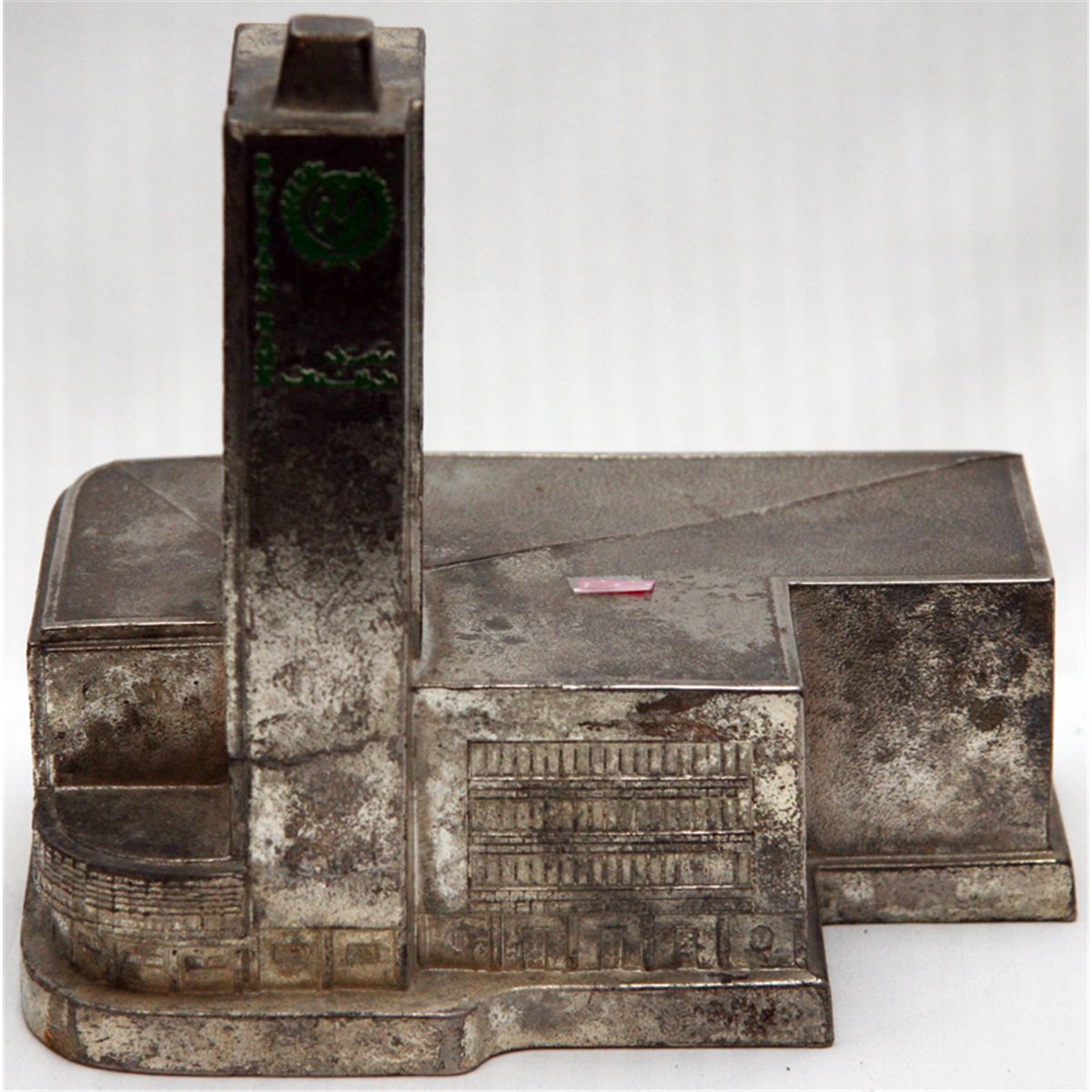 RAFIDAIN BANK (Arabic). Office Building. Coin opening in side of tower. No handle, no key, serial number or patent number. Key lock on bottom. 18cm x 17cm x 14cm. Plated metal. Maker unknown. VF.