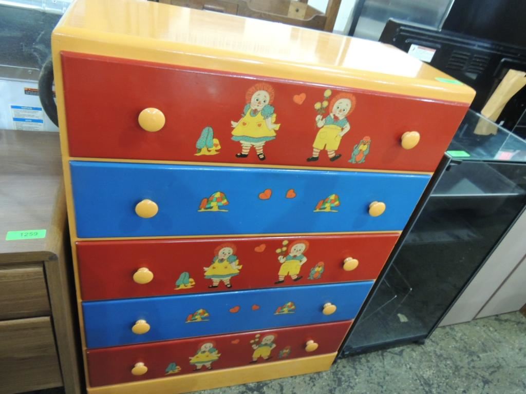 CHILDRENS DRESSER, CHEST DRESSER, UPRIGHT DRESSER, PAINTED, THEME RAGGEDY ANN AND RAGGEDY ANDY AS SHOWN SEE PHOTO FOR MORE DETAILS.