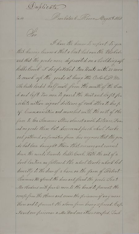 Fine content war-date retained Union naval expedition report written by Acting Master Samuel B. Gregory, USS Western World, 2pp. folio, Piankatank River, (Mathews County, Va.), May 26, 1863, addressed to Adm. Samuel P. Lee, reporting on capturing contraband from a successful blockade runner. In part: "...I have the honor to report to you that having learned that a boat had run the Blockade and that the goods were deposited in a building up Cobbs Creek...The boats landed half mile from the mouth of the creek and left two men to guard the boat and kept pickets within signal distance of each other...and marched with the rest of the force to Geo. Simmons Store almost a mile distance. Found no goods there but discovered fresh wheel tracks and gathered information from his negroes that the goods had been brought there that evening and carried down the woods towards Cobbs Creek. With the aid of a dark lantern we followed the wheel tracks which led directly to the door of a barn on the farm of Robert Simmons. We opened the door and found the goods. Sent Mr. Husband with four men to the house to prevent the escape from the house and secure the prisoners...Captured one prisoner a Mr. Ward one other escaped...Many of the people of Mathews County are desirous of having a stop put to Blockade running as it is injurious to them and they want to inform of all who are engaged in the business...". Fine condition.