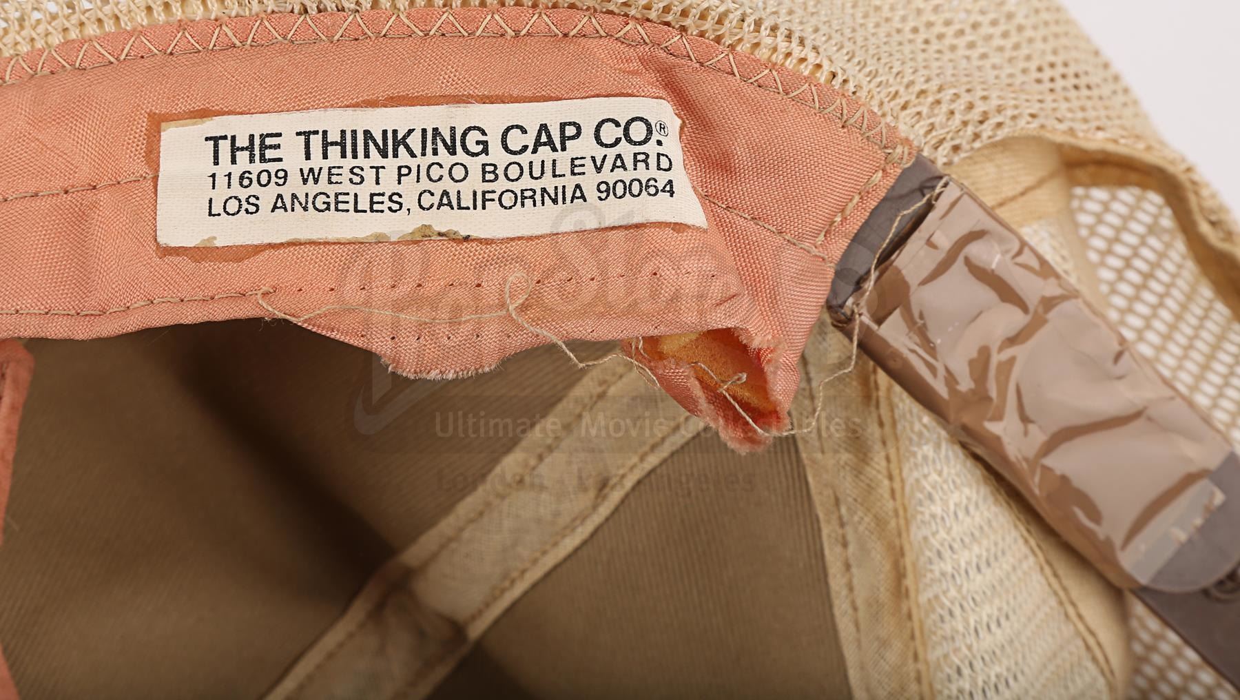 The cap was manufactured by The Thinking Cap Co. and is made of beige cotton with mesh panels. An embroidered Raiders of the Lost Ark patch is attached to the front. It shows signs of age and wear, the light pink sweatband inside shows some staining, and the top of the hat shows some discolouration and trailing threads. In addition, the adjustable buckle is held together with brown gaffer tape.