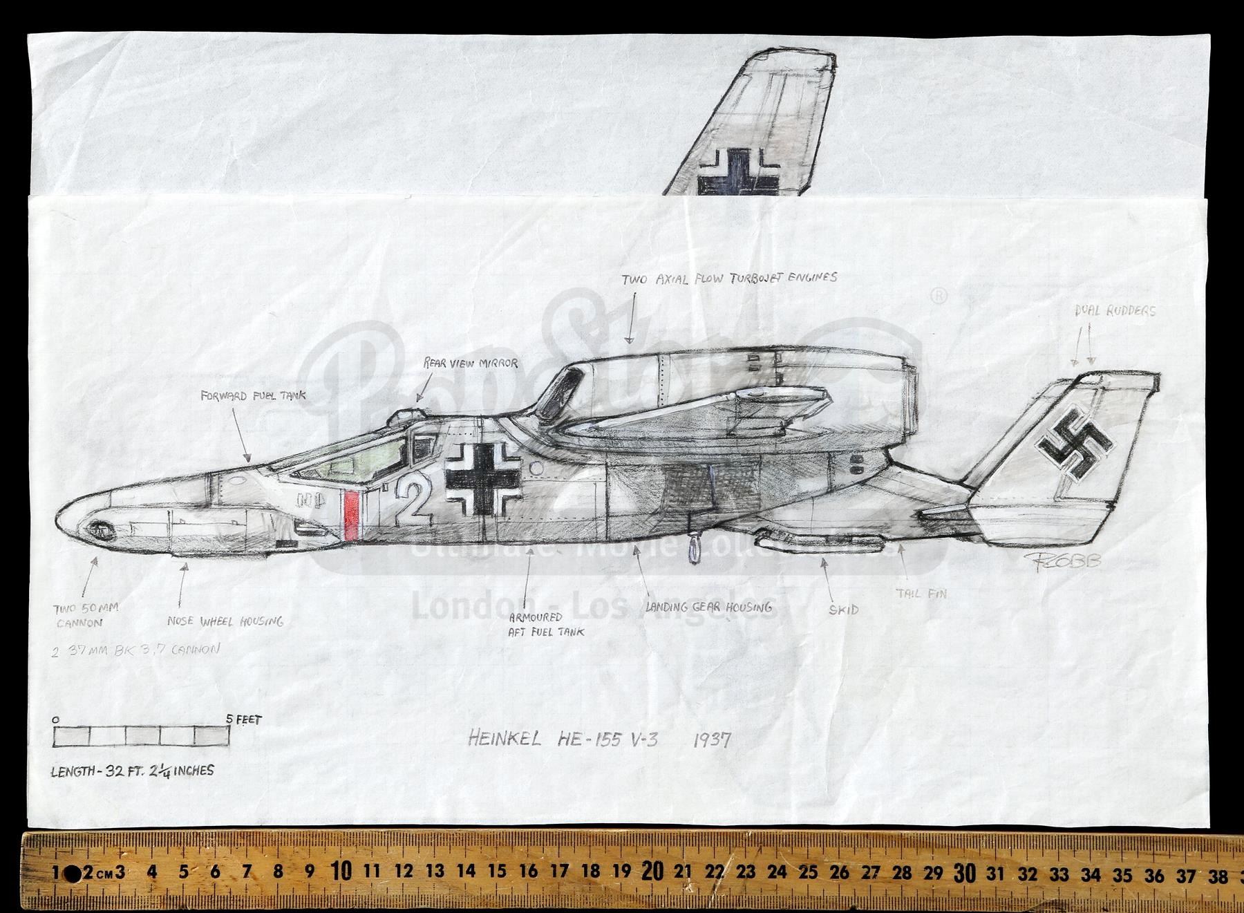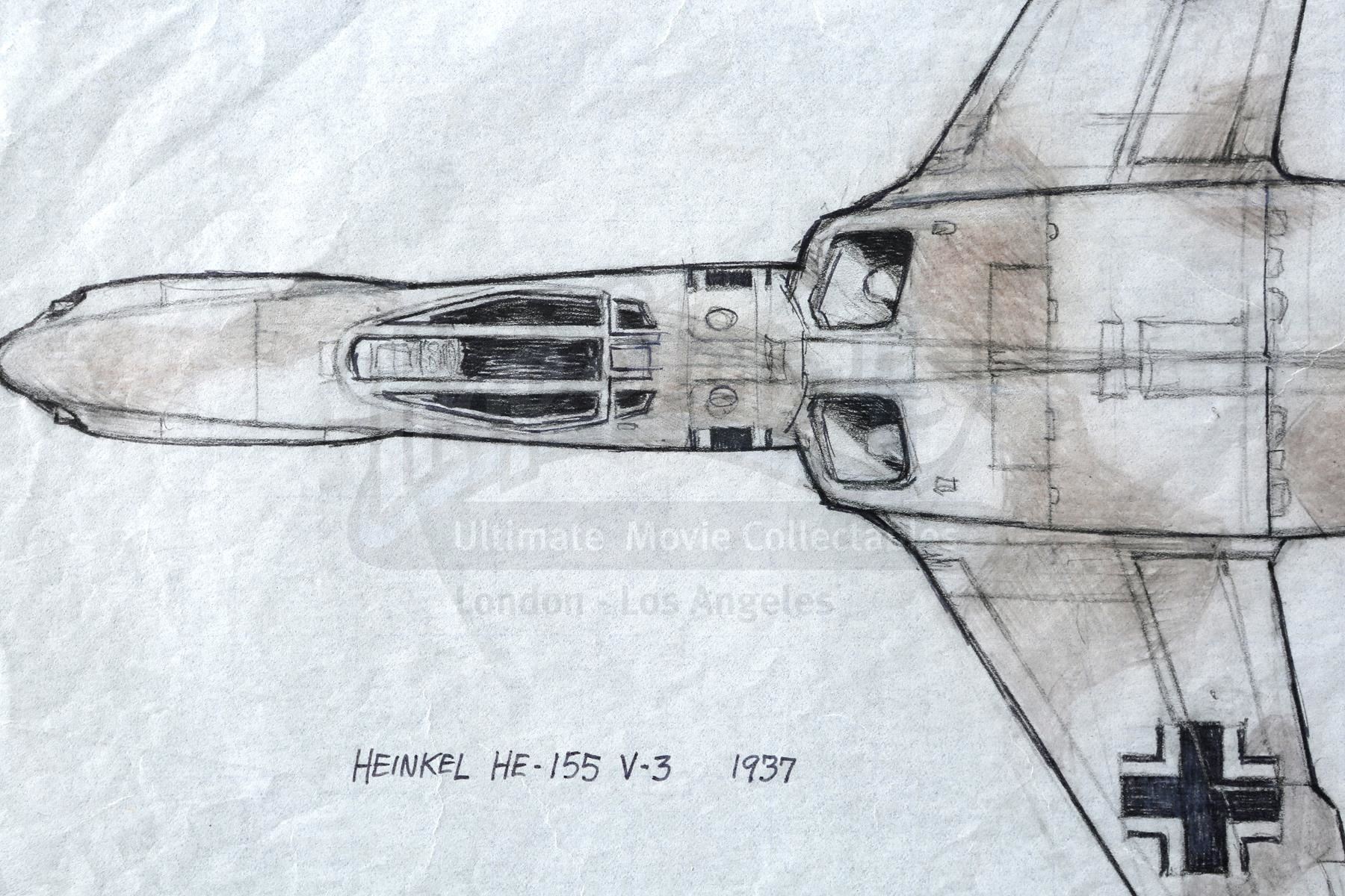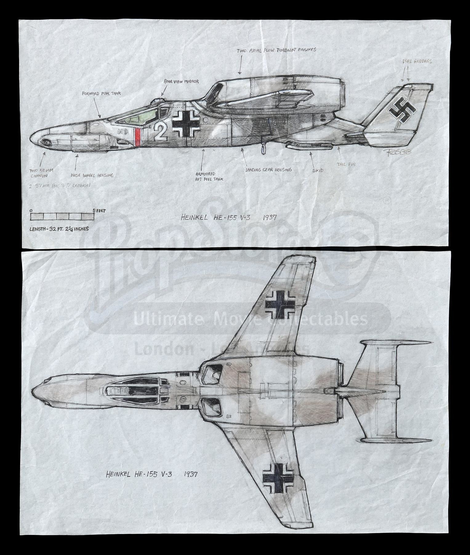These bird's-eye and side-view sketches were devised by production designer Norman Reynolds and production artist Ron Cobb during pre-production. Both are rendered in graphite, ink, and coloured pencil on drafting vellum paper and labelled "Heinkel HE-155 V-3 1937". These pieces exhibit several creases throughout. Dimensions (larger sketch): 25.5 cm x 38 cm (10" x 15"); (smaller sketch): 20.5 cm x 38 cm (8" x 15")