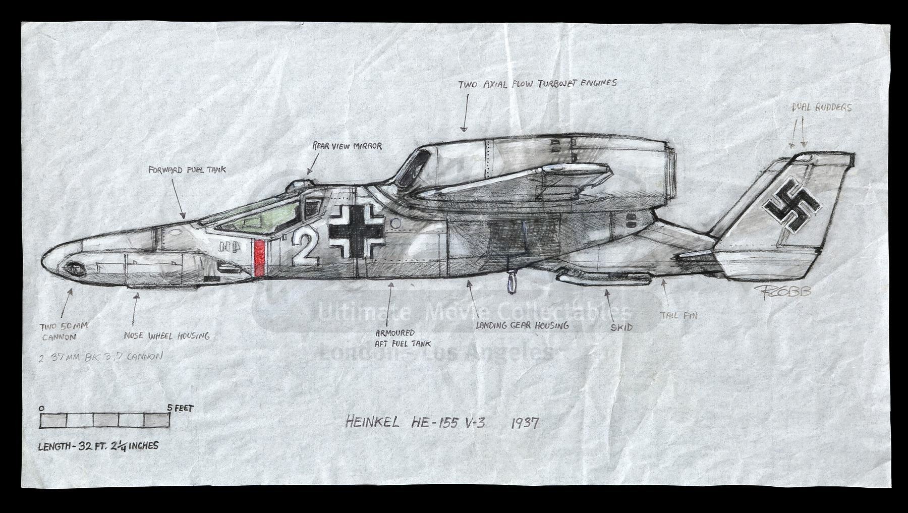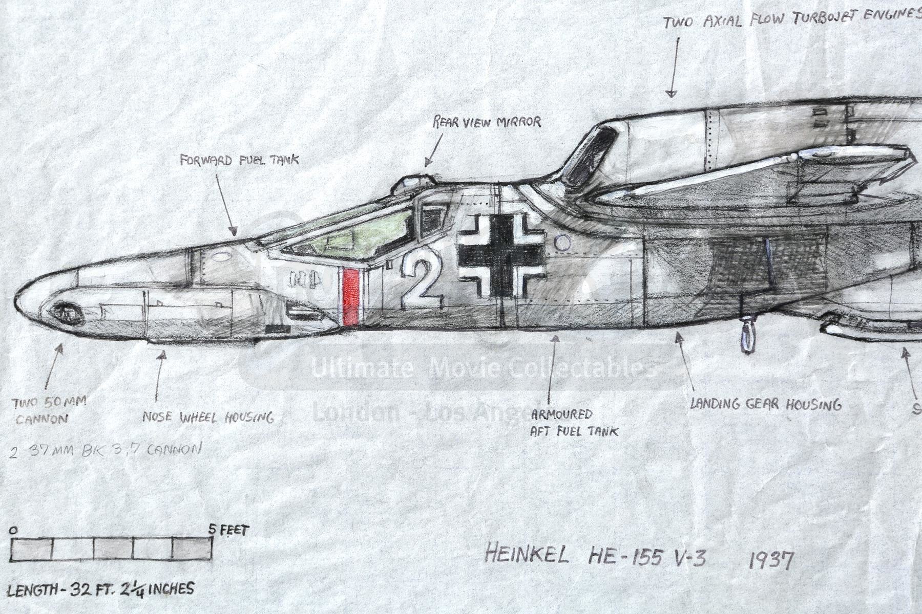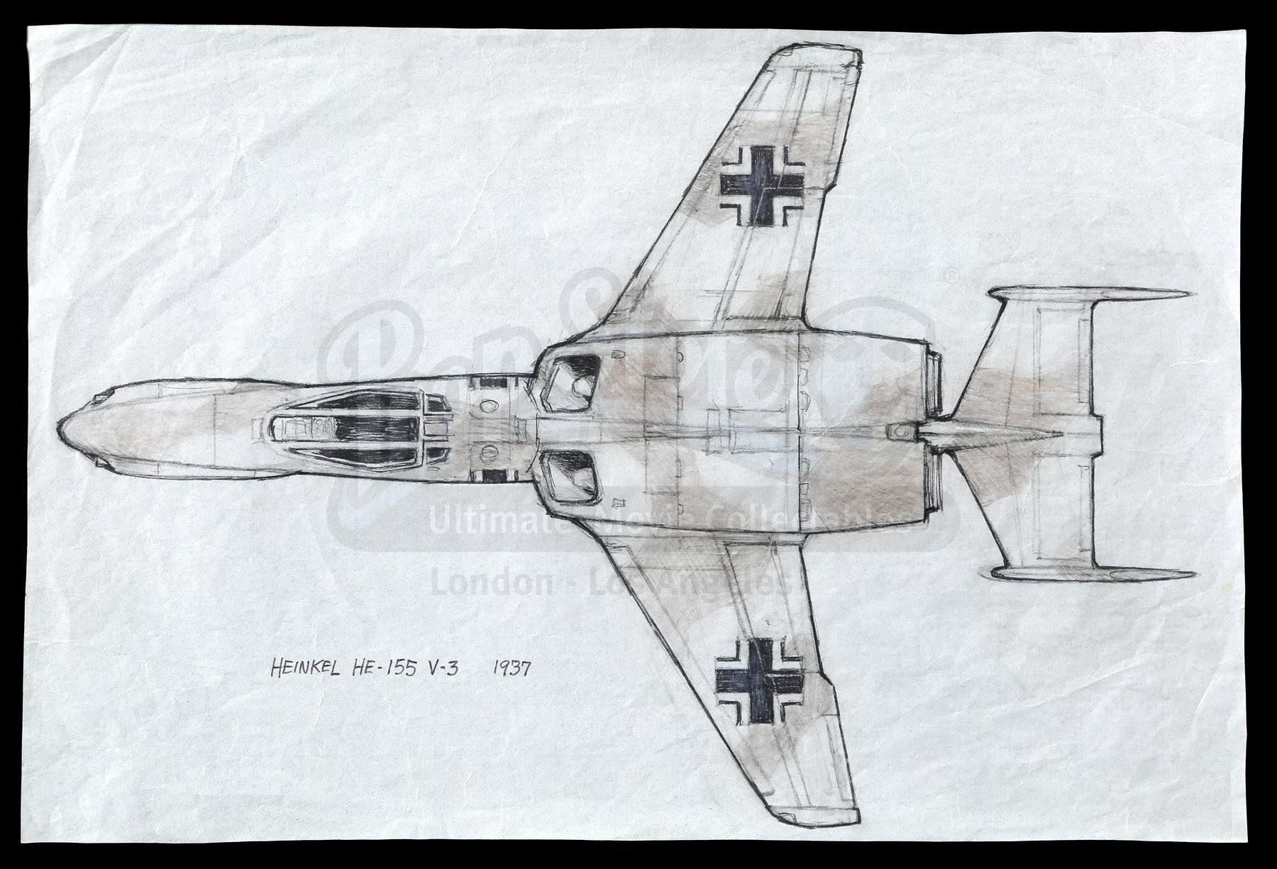 These bird's-eye and side-view sketches were devised by production designer Norman Reynolds and production artist Ron Cobb during pre-production. Both are rendered in graphite, ink, and coloured pencil on drafting vellum paper and labelled "Heinkel HE-155 V-3 1937". These pieces exhibit several creases throughout. Dimensions (larger sketch): 25.5 cm x 38 cm (10" x 15"); (smaller sketch): 20.5 cm x 38 cm (8" x 15")