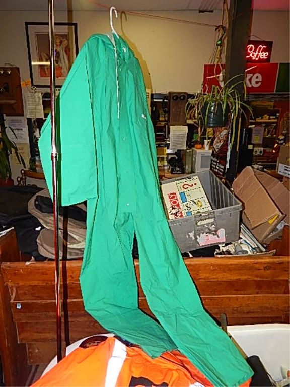 RAIN GEAR - ADULT JUMP SUIT - GREEN - HOOD AS-IS - - M - RETAIL $100 - BUY NOW IN HOUSE - $25 EA SET