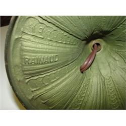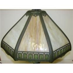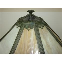 RAINAUD SLAG GLASS TABLE LAMP. Has two light sockets & 8 panel slag glass shade. Original patina is excellent. 21.5" H