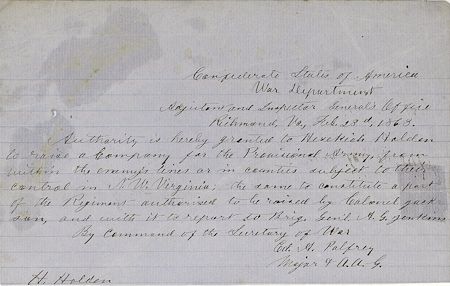 EDWARD A. PALFREY Confederate Major and A.A.G. assigned to the Army of Northern Virginia. An outstanding and historically important A.D.S, 1p. 8vo., on "Confederate States of America, War Department, Adjutant and Inspector Generals Office" letterhead, Richmond, Feb. 23, 1863. In full: "Authority is hereby granted to Hezekiah Holden to raise a Company for the Provisional Army, from within the enemy's lines or in counties subject to their control in N.W. Virginia; the same to constitute a part of the Regiment authorized to be raised by Colonel Jackson [future Brig. Gen. and cousin of Stonewall Jackson, William Lowther "Mudwall" Jackson], and with it to report to Brig. Gen'l A.G. Jenkins. By command of the Secretary of War". According to Generals in Gray, "Mudwall" served on Stonewall Jackson's staff until February 1863, when he recruited the 19th Virginia Cavalry within the Federal lines and was elected its colonel. With this command, a part of the brigade of General A.G. Jenkins, he was active in the Shenandoah Valley campaign". Some creases and slight discoloration are evident but they do not detract from the document. Overall, very good condition.