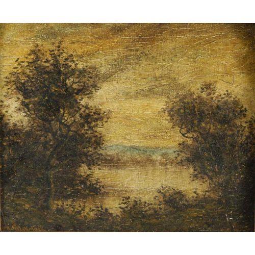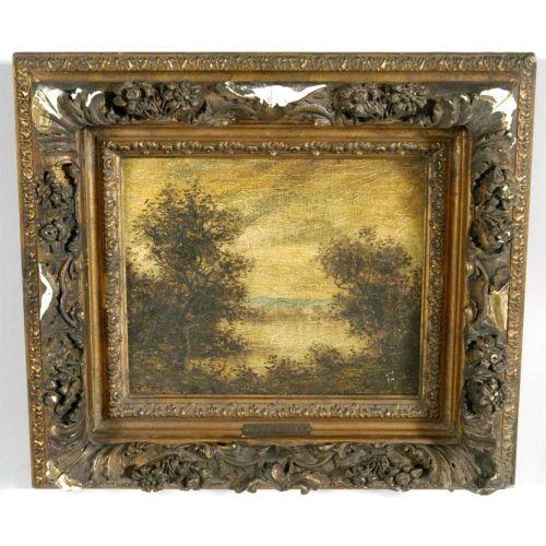 RALPH A. BLAKELOCK Opening in a Landscape 10 1/4"x 12 3/8" oil on canvas, signed lower left CONDITION REPORT: dirty. PACKING AND SHIPPING: We offer packing (double boxed in most cases) and shipping of this item within the Continental United States by USPS or UPS (our choice- boxes over 30lbs or oversized may be recalculated based on buyer's location), NOT INCLUDING INSURANCE (it will be added when we know the sales price) for $40