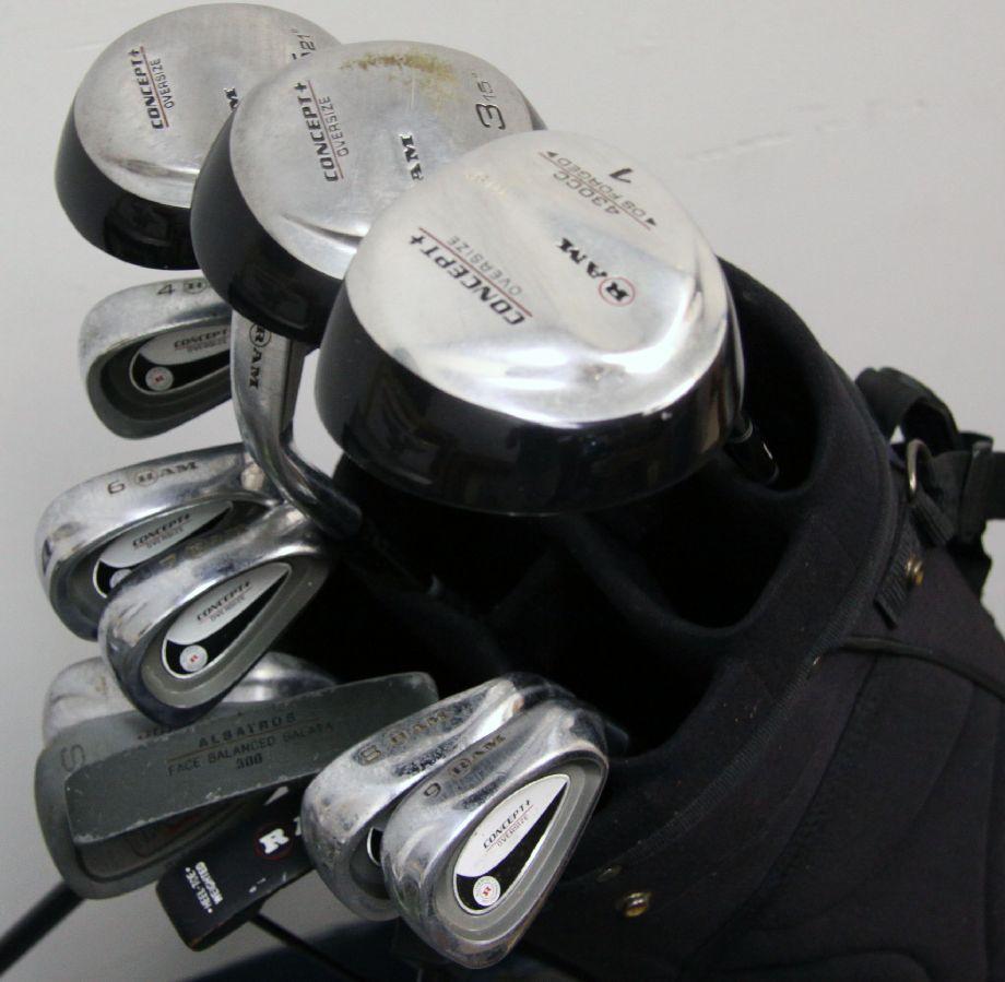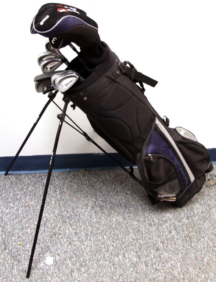 Full set including drivers #1,3,5 and #3 iron-wood all with graphite shafts. Irons include # 4,5,6,7plus ,8 and 9 plus pitching wedge and putter. Also included is an Albatross putter and a Dunlop sand wedge. All clubs are in good used condition and in need of a good cleaning. Bipod bag with shoulder strap is in very good condition.