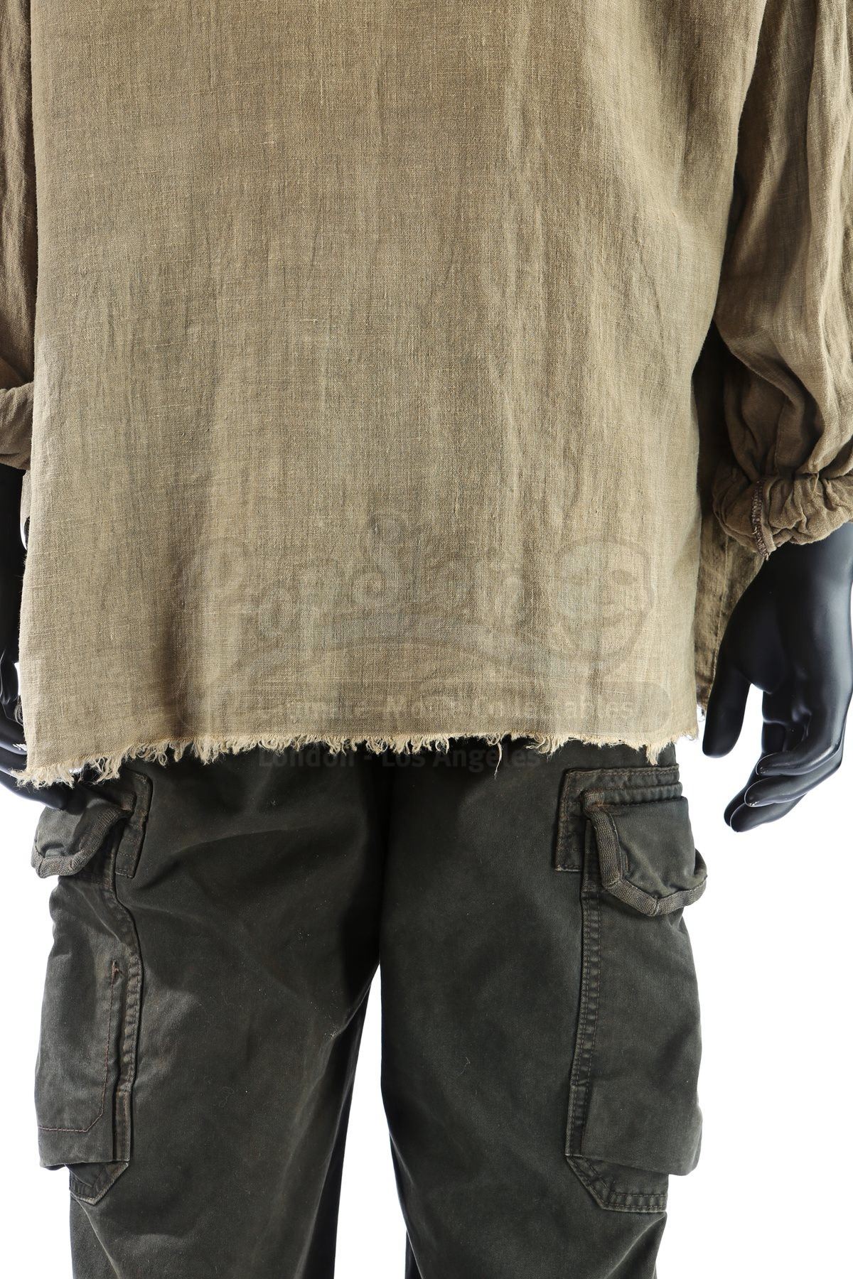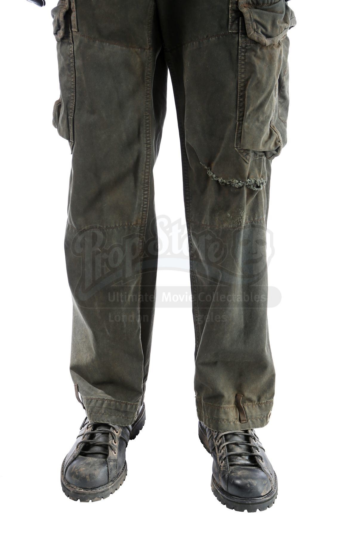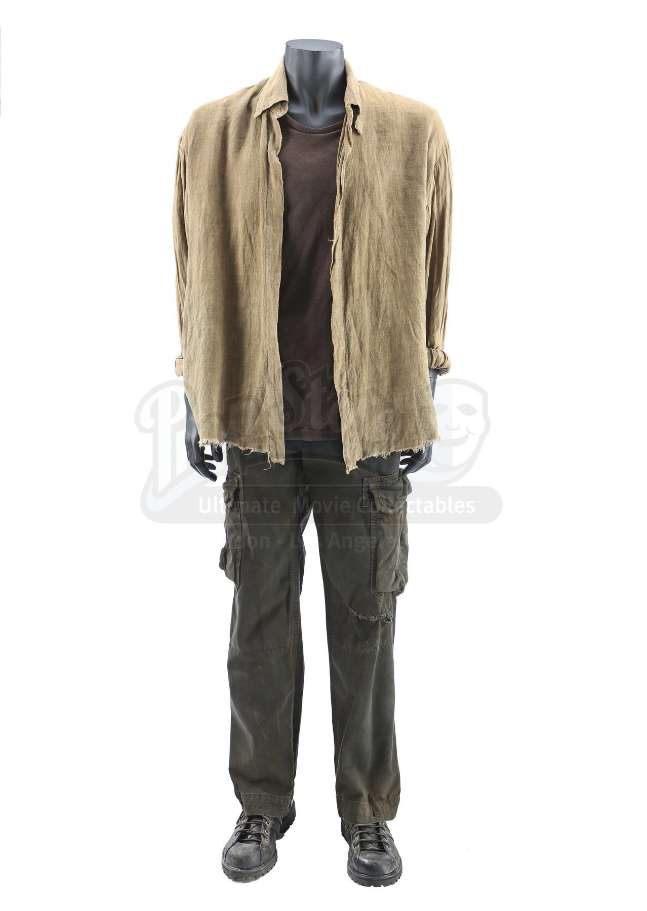 Rambo’s cargo pants show a frayed tear at the left knee which is partially stitched together. The black leather Adidas boots show “SLY” handwritten in black ink on the tongue of the right shoe. Paired with the costume are two wardrobe tags that note the costume as “CHANGE 4” and “END STAGE AFTER BULLET HIT”. Accompanying this lot is a certificate of authenticity from Stallone’s official “Stallone – The Auction .” The costume exhibits intentional production distressing, with dirt and grime throughout, but remains in very fine condition.