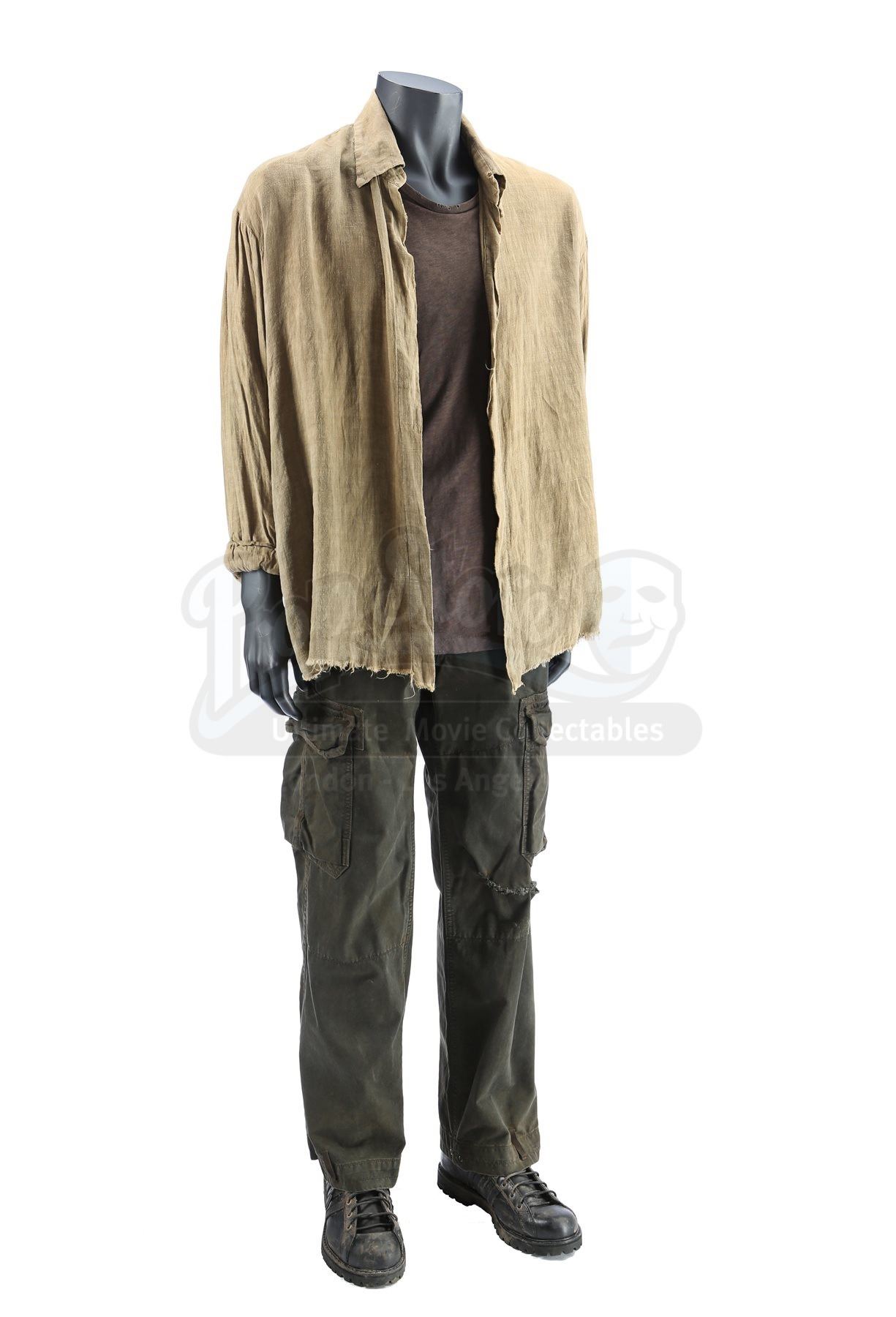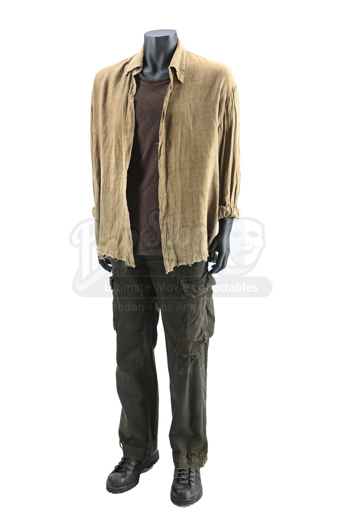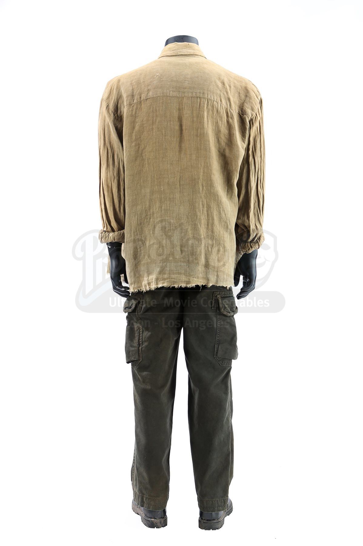 Rambo’s costume includes an olive-coloured long-sleeve shirt, brown T-shirt, dark green cargo pants, and a pair of black leather boots. The buttonless long-sleeve shirt is made of linen and shows “#1” handwritten on the collar in black ink. The tattered T-shirt shows a bullet-hole on the left shoulder, which Rambo sustained while operating a Jeep-mounted M2 machine gun.