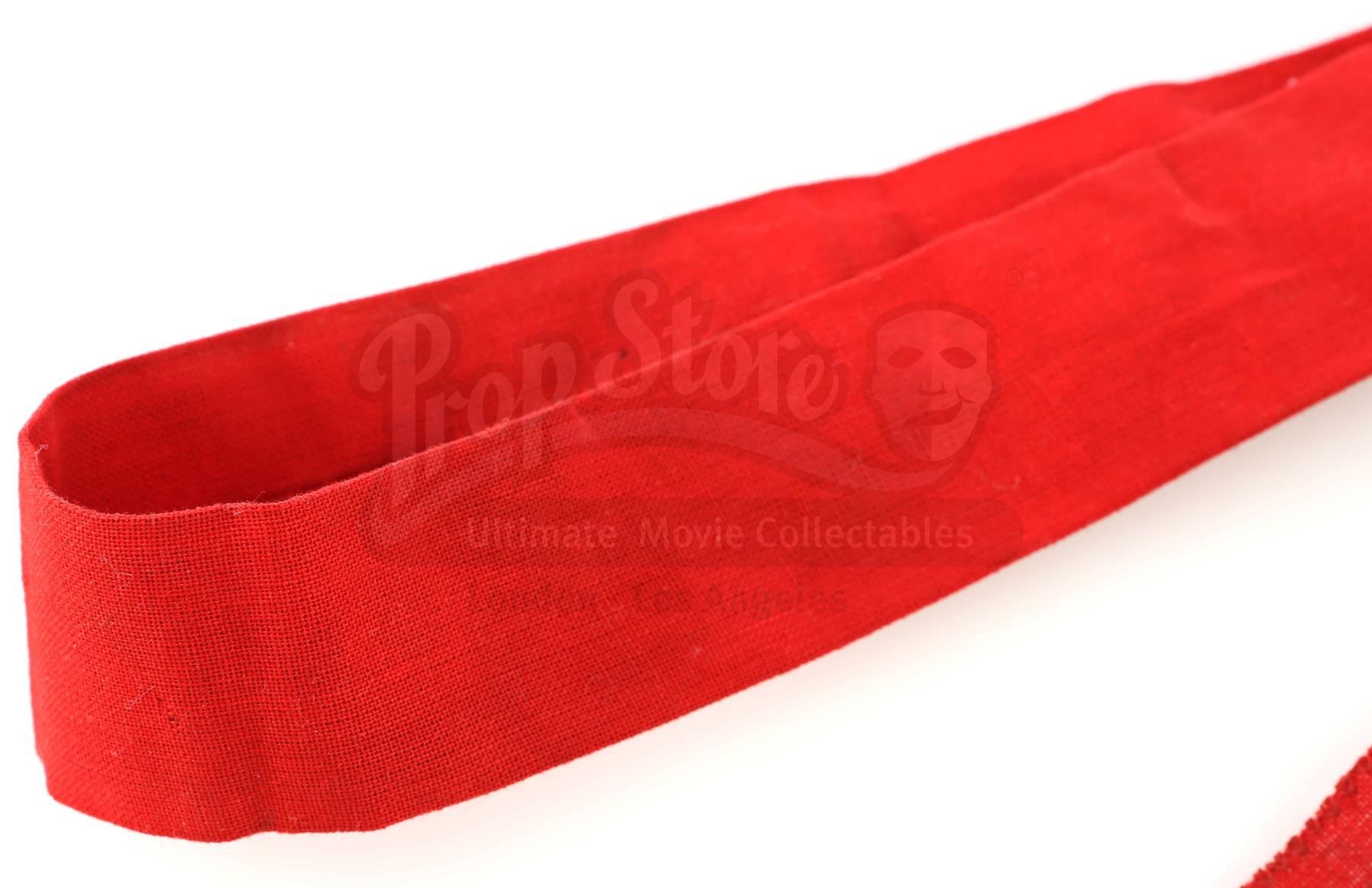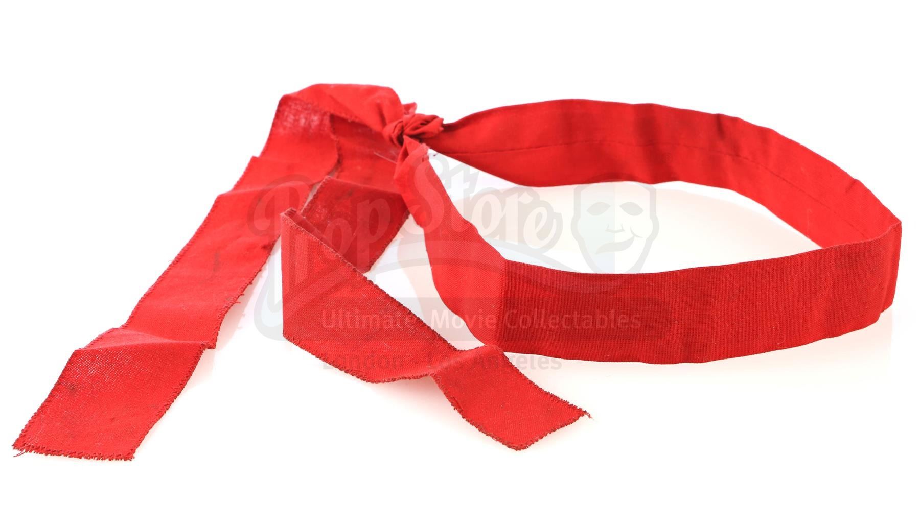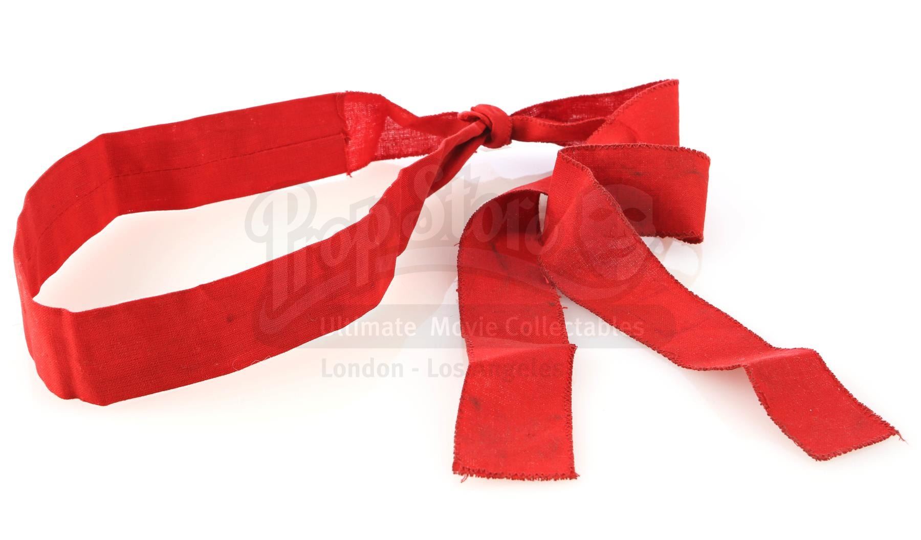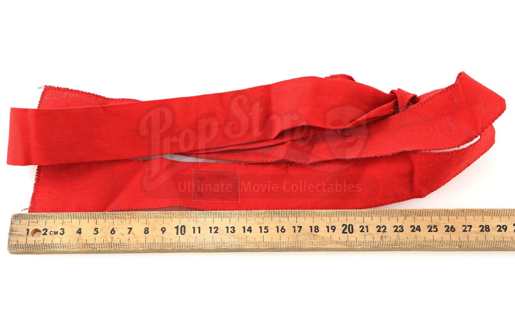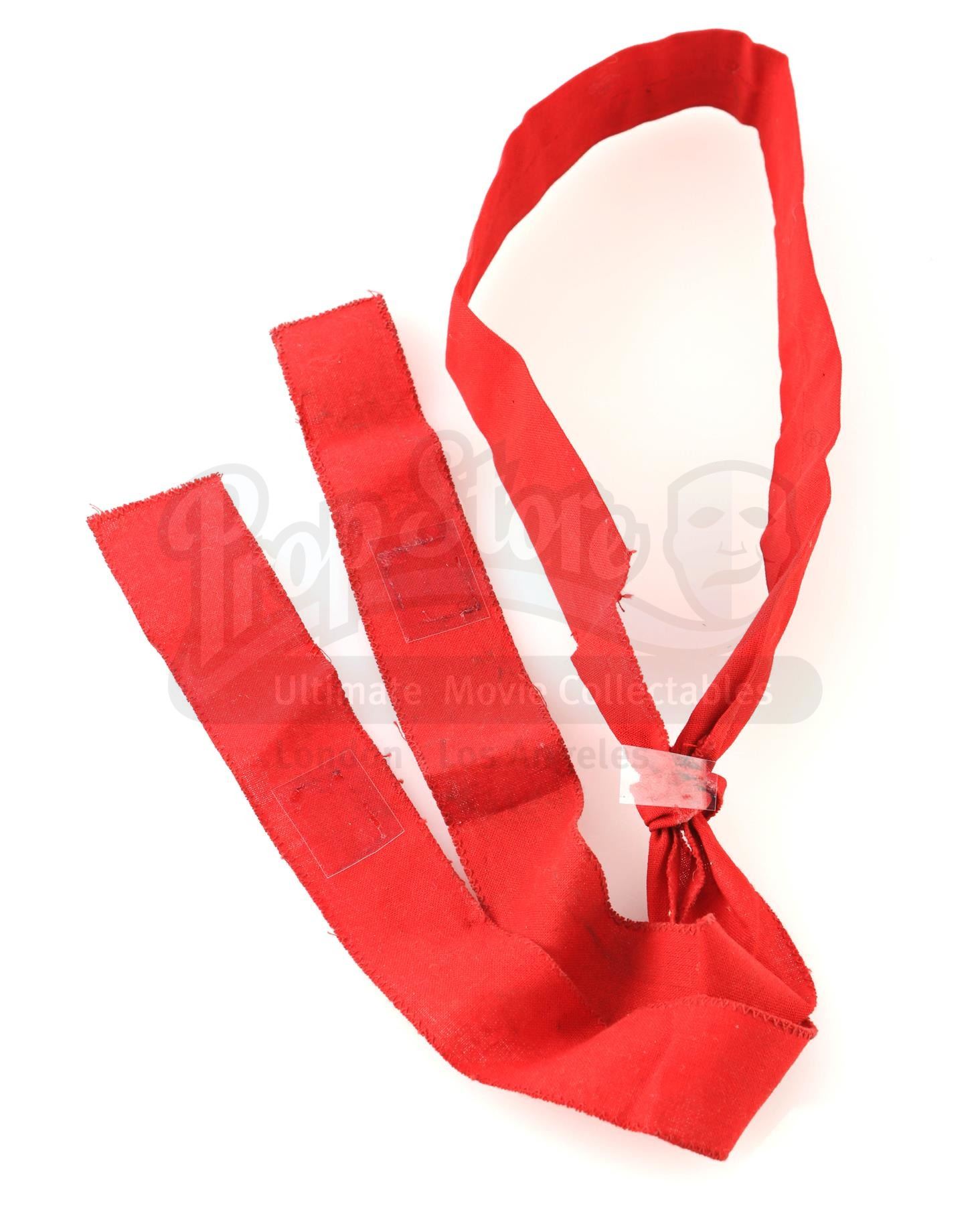 This headband is made of red cloth distressed and stained by production to appear sweaty from use. It is tied in a knot and features three pieces of tape for securing it to the actor's head. The lot exhibits light fraying from age. Dimensions: 63.5 cm x 5 cm x 5 cm (25" x 2" x 2")