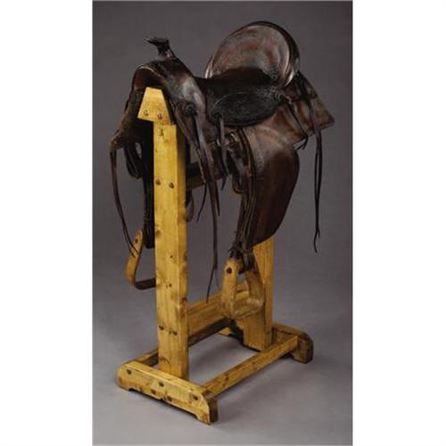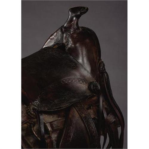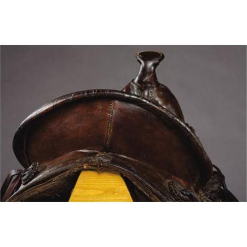 <B>RANCH KING SADDLE Circa 1890-1900</B></I> - Sold in Spiegel catalog from Chicago; Square skirts and double rigged but left rear ring is missing; Embossed leather details.<BR><BR><B>Condition:</B></I> Poor to Fair.<BR><BR><b>Shipping:</b> Other (oversized items, group lo (<a target="_blank" href="http://www.heritageauctions.com/common/shipping.php">view shipping information</a>)