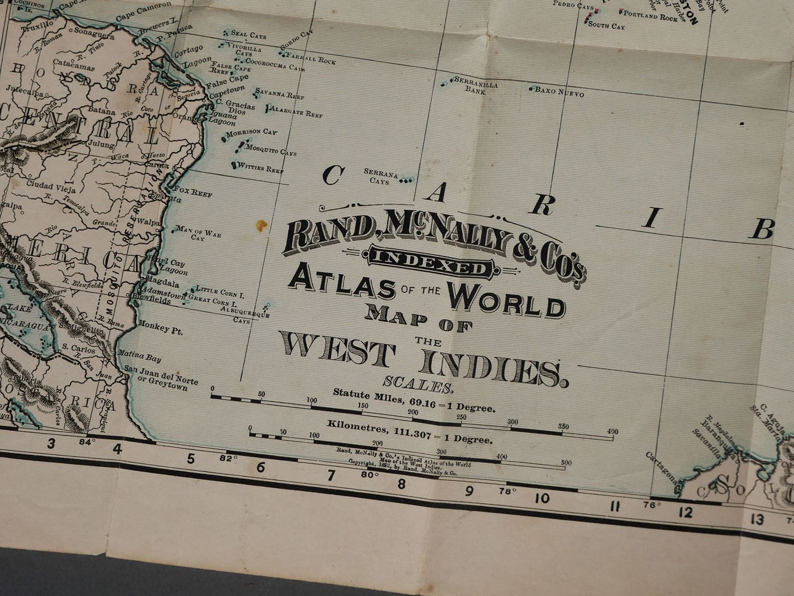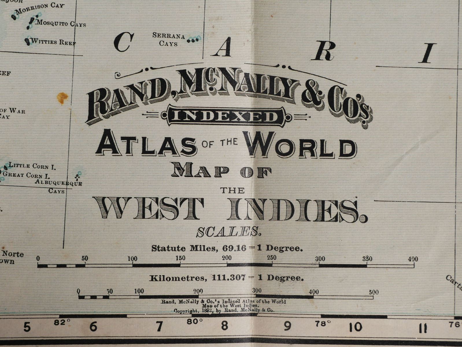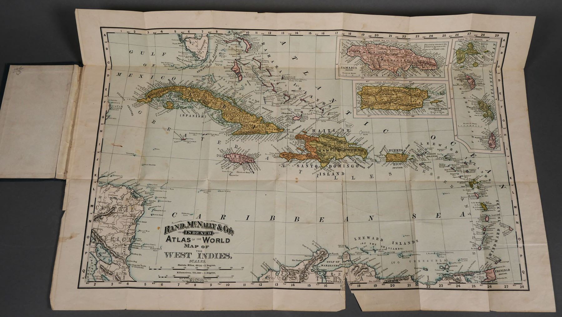 Rand McNally & Co. indexed atlas of the world color pocket map of the West Indies, copyright 1892. Folded in book dimensions are 6" x 3 5/8". Unfolded map measures approx. 21" x 14". Map does have some tears, see photos for more details on condition.