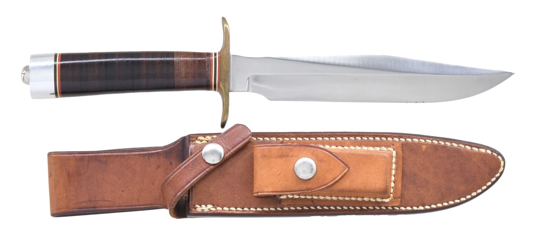 7" blade. 12" overall including butt cap nut. Blade is marked on left side "RANDALL MADE / ORLANDO, FLA.". Flanked by the Randall logo. Brass double hilt. Smooth stacked washer handle w/ red, white & black spacers at each end. Duralumin butt cap retained by acorn nut. Stitched brown leather sheath marked on back of belt loop "RANDALL MADE / KNIVES / ORLANDO, FLA". Sheath includes pouch w/ combination Crystolon stone. UNATTACHED ACCESSORIES: padded black nylon case. Knife is in very good condition. Blade shows little or no wear. Brass hilt has turned a dark patina. Handle & butt in very good condition w/ only very tiny handling marks. Sheath shows a small amount of very careful use w/ very light wear & staining. Stitching is tight & complete. (02-23685/RW). NON-GUN. $600-900.
