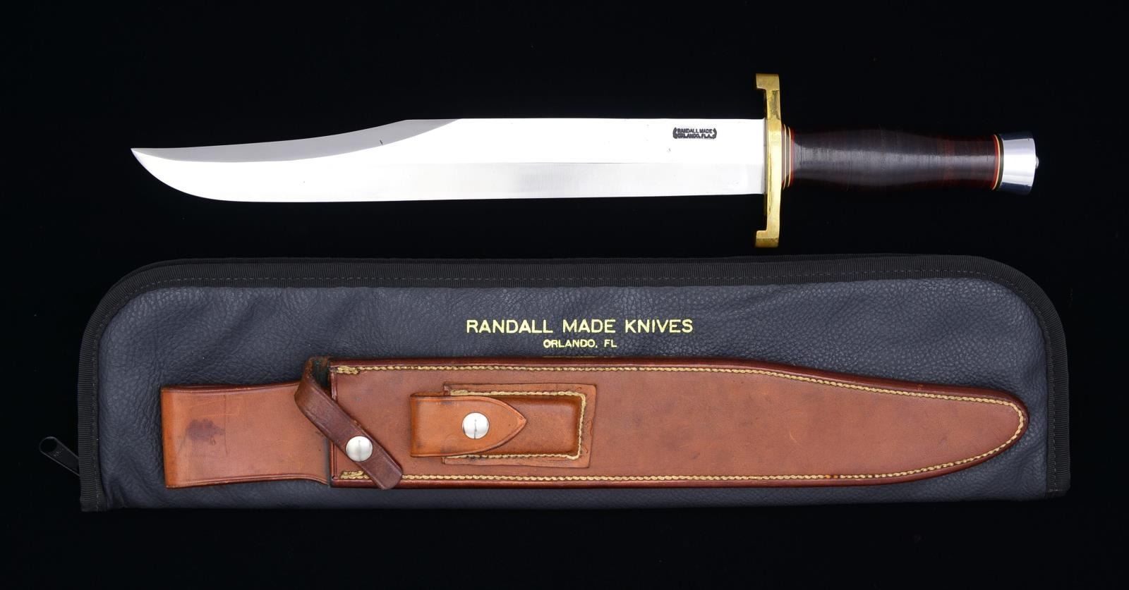 BAG. 13" Blade, 18 1/2" overall. Blade marked “RANDALL MADE / ORLANDO FLA.”. Dbl. lugged brass hilt. Leather handle. Silver colored buttcap. UNATTACHED ACCESSORIES: brown leather sheath w/ sharpening stone. Sheath is marked on back of belt loop “RANDALL MADE KNIVES / ORLANDO FLA.”, “12”, & “13”. Plain snaps. Knife also has black padded zipper case in very good condition marked “RANDALL MADE KNIVES / ORLANDO FL.”. CONDITION: blade has scattered spots of discoloration on both sides w/ scattered sm. scratches. Hilt has areas of discoloration on both sides & light wear. Leather handle has light overall wear. Buttcap has light wear & handling marks. Scabbard has light wear & staining. Stitching is tight. PROVENANCE: Collection of Alan Bradley Shepherd. (02-14655/RW). $600-900.