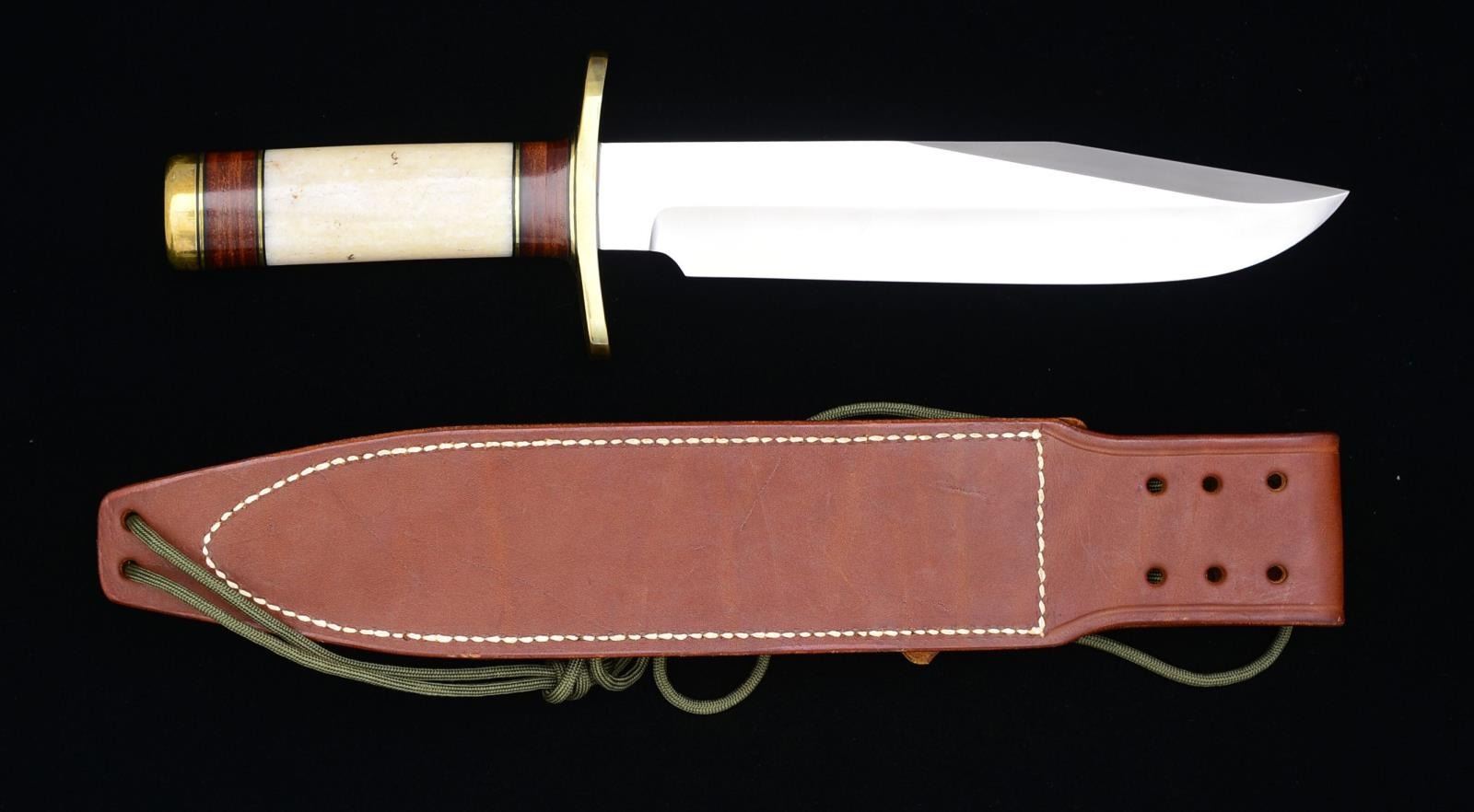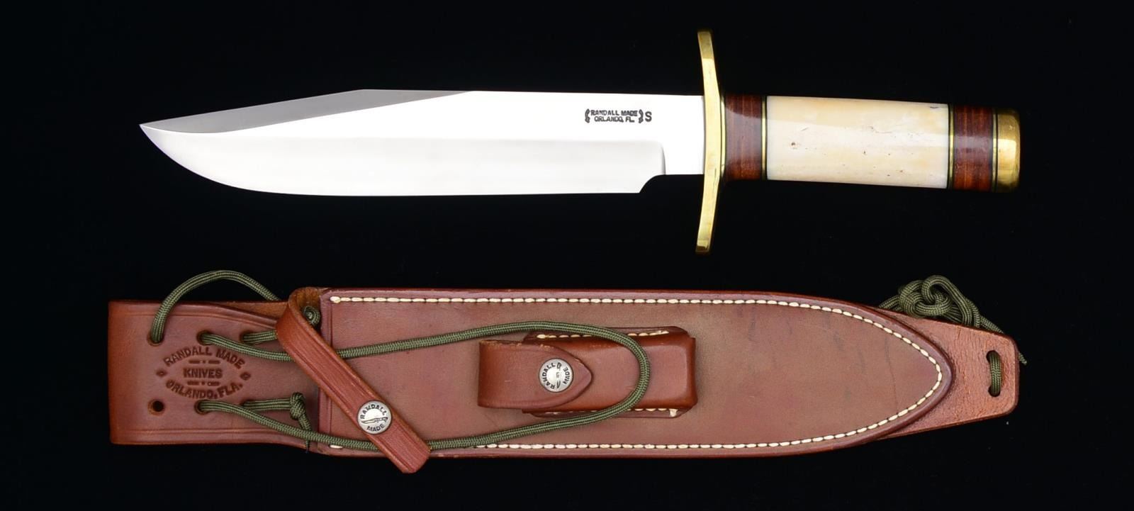 9" Blade, 14" overall. Blade marked “RANDALL MADE / ORLANDO FL.” Micarta handle w/ brass pommel. UNATTACHED ACCESSORIES: brown leather sheath marked “RANDALL MADE KNIVES / ORLANDO FLA.” Snaps are marked “RANDALL MADE”. Sheath includes sharpening stone. Sheath tip & belt loop punched for paracord thongs. CONDITION: blade has very good appearance. Micarta handle has flecks & sm. scratches. Brass parts have light high point wear. Sheath has very good appearance w/ very light scattered scuffing & handling marks. Stitching is tight. PROVENANCE: Collection of Alan Bradley Shepherd. (02-14658/RW) $600-900.