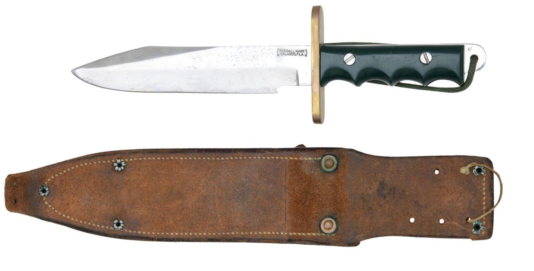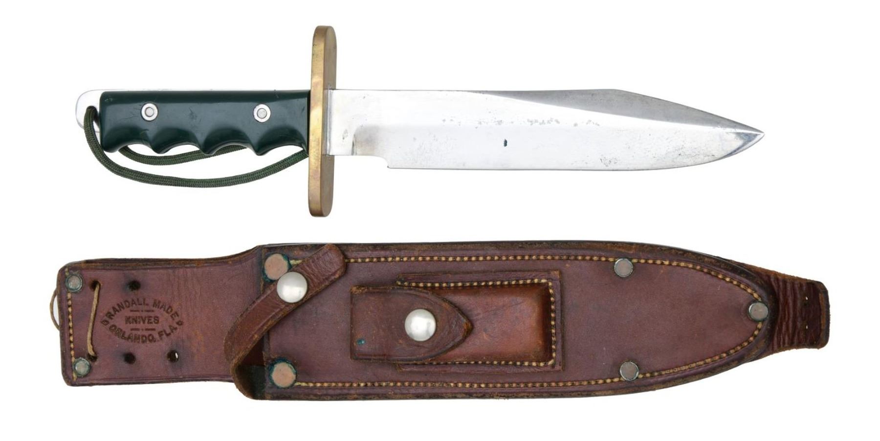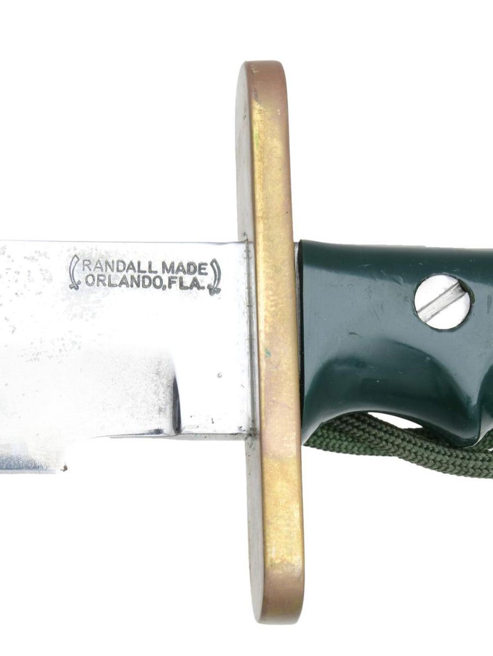 KNIFE. 11.75" overall, 7.2" blade, top edge is also sharpened for 2", maker mark "RANDALL MADE / ORLANDO FLA" with flanking simitars. Early screwed green tenite finger grooved grip, heavy thick long tang with lanyard hole at pommel. Compete with early steel riveted Randall brown leather military sheath with honing stone and fitted with tie down rawhide thongs. UNATTACHED ACCESSORIES: two 3" paper and foil tags that were attached to both knife & sheath. Each has "RII-73 / 14-71/2". CONDITION: good overall, knife has seen moderate use, sharpening, re-polished, re-pointed, small areas of staining and pitting. Grip, heavy brass cross guard, and sheath are very good. (02-22723/BH). NON-GUN. $3,500-5,000.