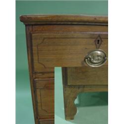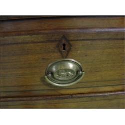 RANDOLPH COUNTY, NORTH CAROLINA WALNUT GENTLEMAN'S CHEST. Cut-out bracket feet. Line inlay decoration around drawer fronts and top. 2 over 3 graduated dovetailed drawers. Thumb molding around top. Replaced brass drawer pulls. Original locks on drawers. Staining and surface scratching to top. Left side is split as well as third drawer front. Primary wood is walnut and secondary wood is pine. 44" H, 36" W, 19.25" D