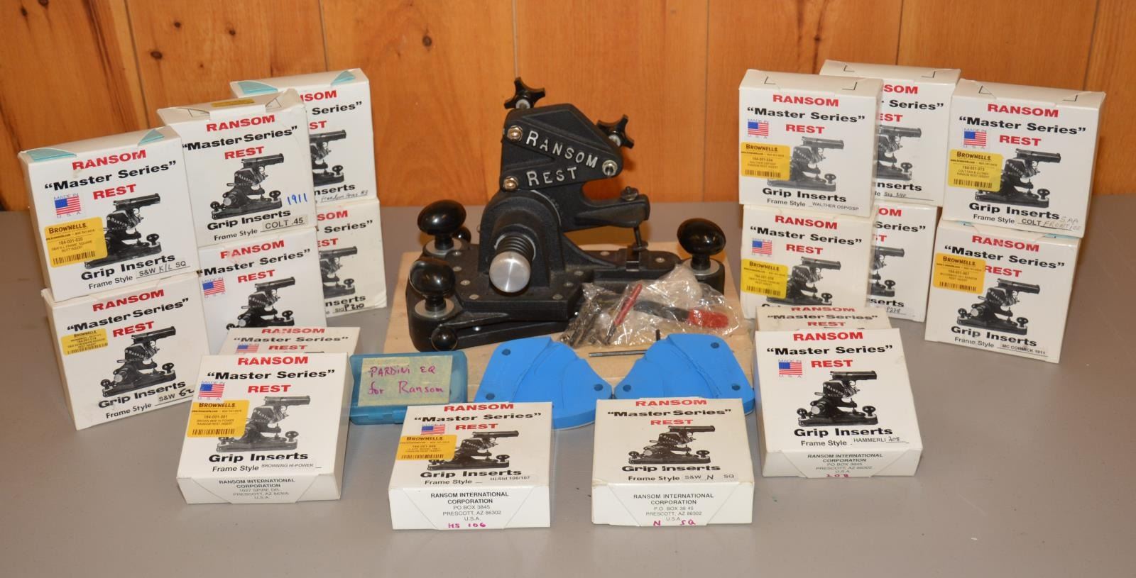 Ransom Shooting Rest w/ box inserts for High Standard Models 104 & 106/107; Sig Sauer Models 210, 228 & 240; S&W Models 52, K/L frame square butt, N rnd. & N square; Colt Models SAA & 1911; Walther Models PPK/S & OSP/GSP; Freedom Arms Model 83; Browning Hi-Power; McCormick Model 1911; Pardini Model SPE; Hammerli Model 208. CONDITION: all items near excellent. PROVENANCE: From the Frederic W. Thrane Collection. (02-14153-3/NW). $650-900.