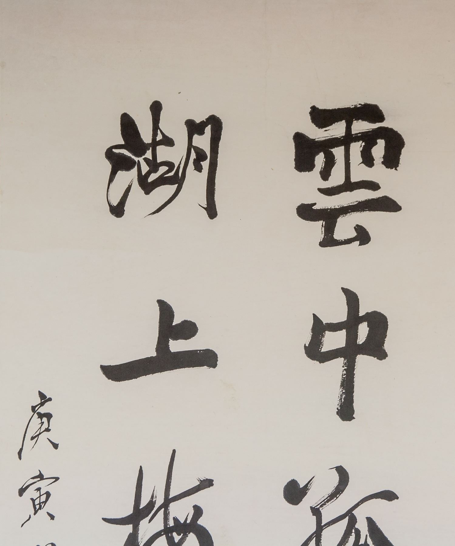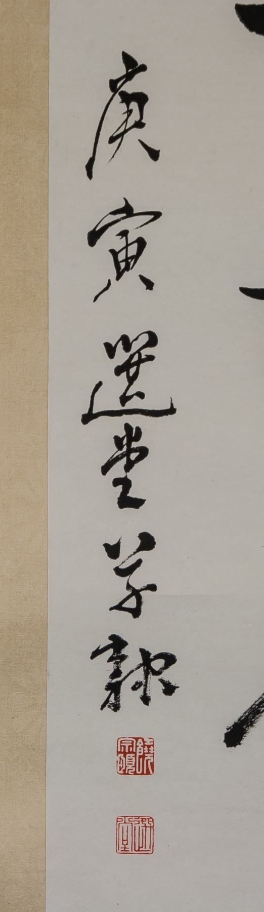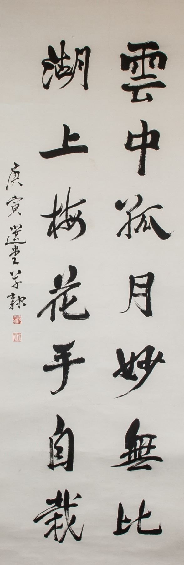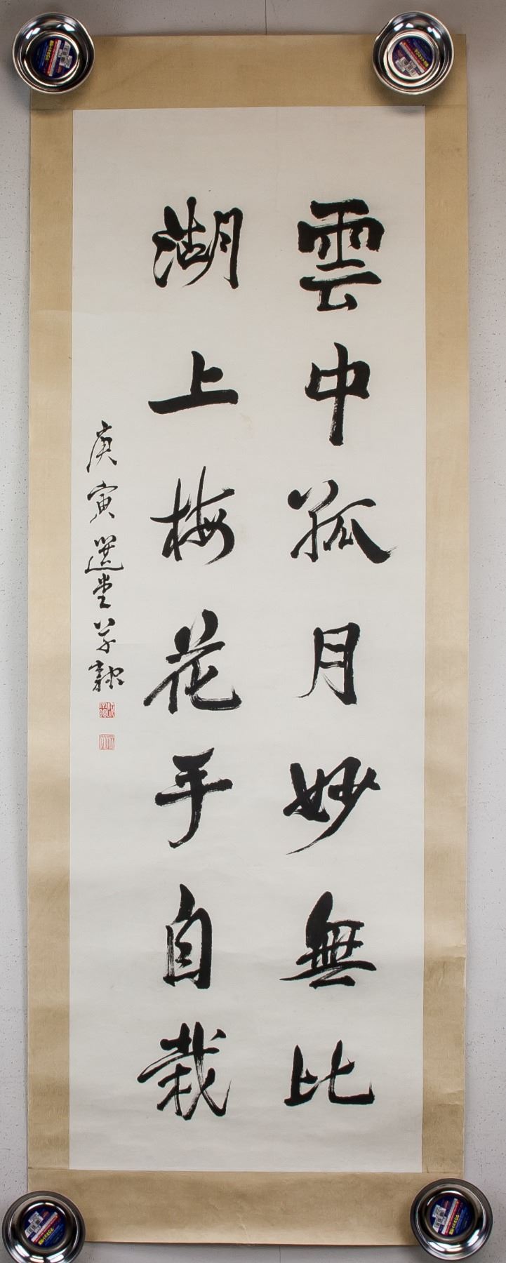 Ink on paper roll, featuring Chinese calligraphy in semi-cursive script, signed and attr. Rao Zongyi (Chinese, 1917-2018), inscribed with 2 artist seals, 138 x 46 cm. Rao Zongyi was a Chinese painter, calligrapher, and scholar known for his expertise on Chinese culture. Born Jao Tsung-I on August 9, 1917 in Chaozhou, China, he was mostly taught by his family rather than through any formal education. Despite this, he became a versatile and profoundly knowledgeable scholar, teaching musicology, archaeology, and art history, among other subjects. Rao worked as a lecturer and researcher in mainland China before moving to Hong Kong in 1949. He was widely known for his work as a scholar, and held lectures in Japan, France, and the United States. The artist’s most celebrated publications include Oracle Bone Diviners of the Yin Dynasty and a translation of the Babylonian epic Enûma Elish. In 1997, Rao was given the Lifetime Achievement Award from the Hong Kong Arts Development Council. The artist died at the age of 100, on February 6, 2018 in Hong Kong, China. PROVENANCE: Property of a gentleman (East Toronto, Canada)