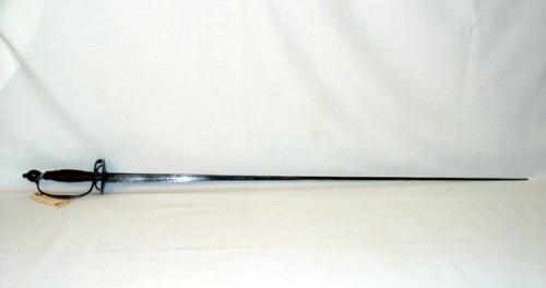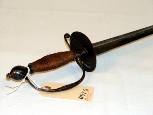 RAPIER: FRENCH(?) DUELING RAPIER WITH STEEL HILT AND BRASS WIRE WRAPPED HANDLE, TRIANGLE BLADE, ENGRAVING ALONG BLADE, HANDLE LOOSE, 39" LONG