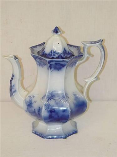 RARE 11 1/2" SCINDE FLOW BLUE COFFEE POT BY ALCOCK - PROFESSIONAL REPAIRS TO BOTH TOP & BOTTOM;