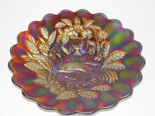 RARE 11" NORTHWOOD CARNIVAL CHOP PLATE-PEACOCK AT URN PATTERN IN VERY UNUSUAL STRAWBERRY PUCE COLOR - GREAT LUSTRE & DETAIL