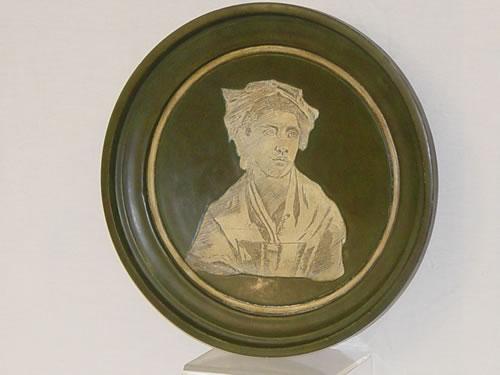 RARE 14 1/4" WALLEY POTTERY MATTE GREEN WALL PLAQUE W/ INCISED PORTRAIT OF PHILLIS WHEATLEY, AMERICA'S 1ST BLACK POETESS (1753-1784), SIGNED W.J. WALLEY INCISED ON BACK - SEVERAL VERY SM. GLAZE RUBS & NICKS ON FRONT RIM, SM. BACK INTERIOR RIM NICK