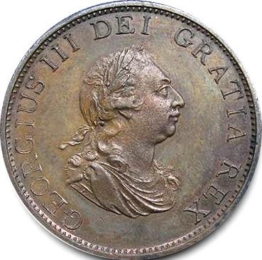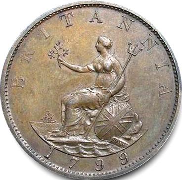 Britannia seated left, branch upward in right hand, trident in left, shield at side, ship with five incuse gunports, SOHO on brick, 1799 below